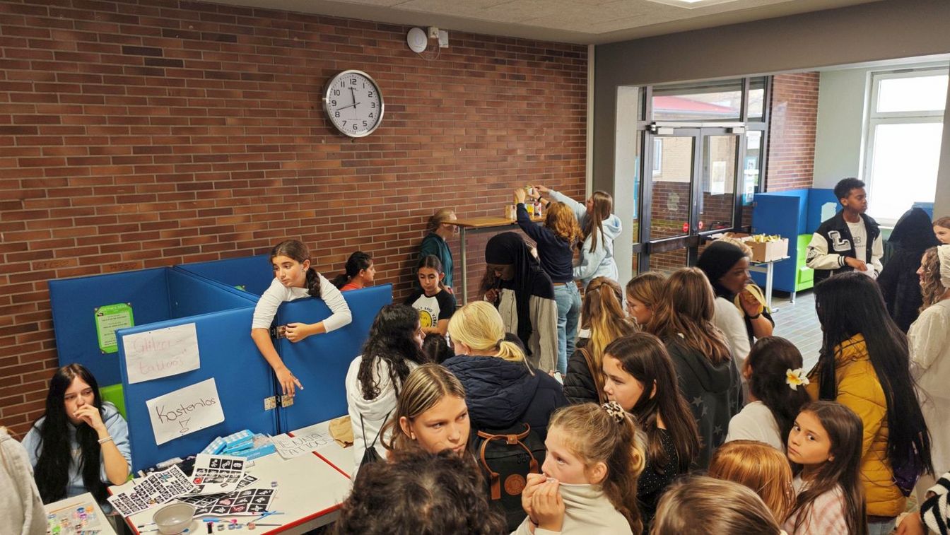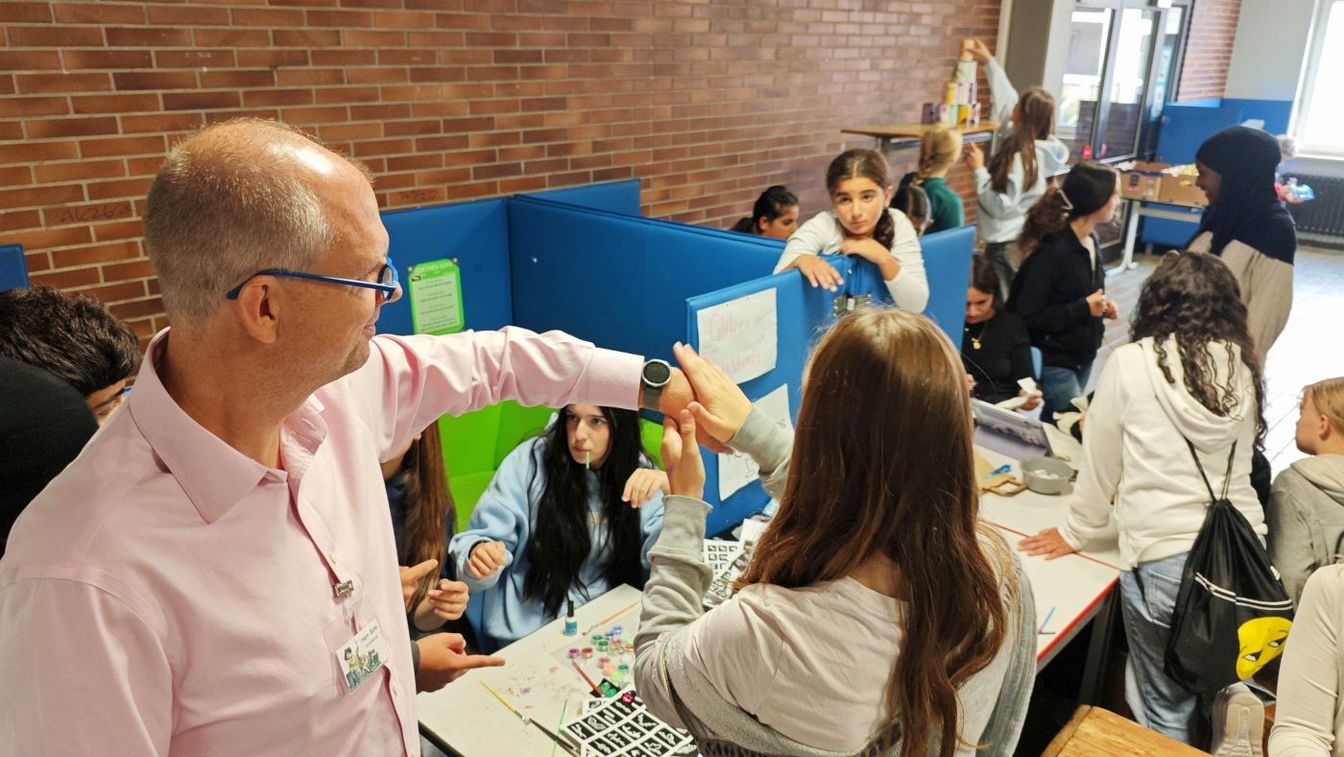 „Wir haben auch Besuch von Frau Sommer bekommen, die vor 50 Jahren eine der ersten Schülerinnen war und deren Familie mittlerweile in der vierten Generation in der KGS ist“, freute sich Bohn und musste sich von einer Schülerin ein Glitzer-Tattoo auf die Hand machen lassen.