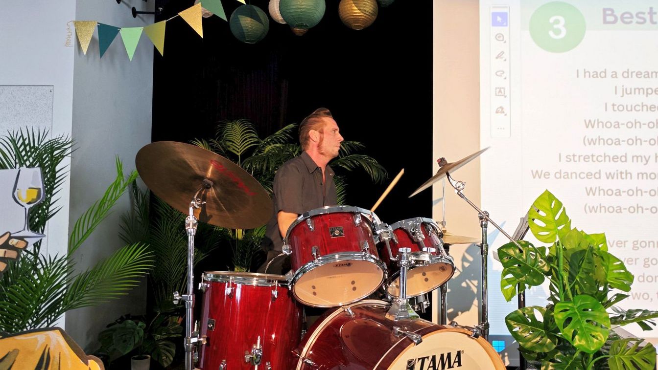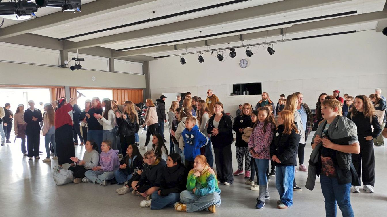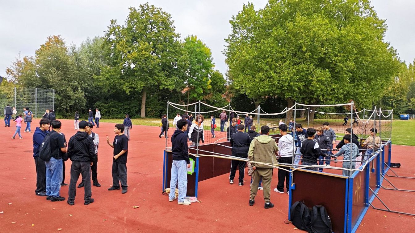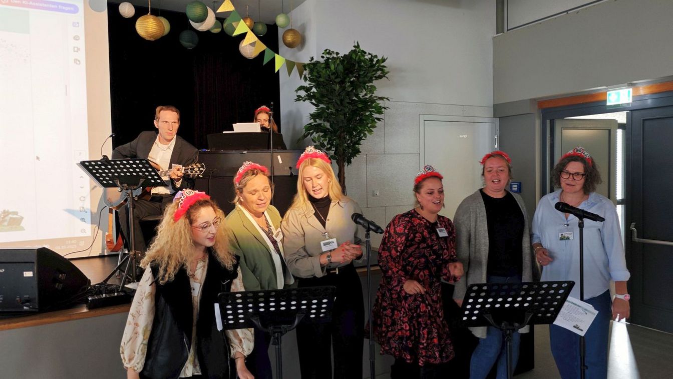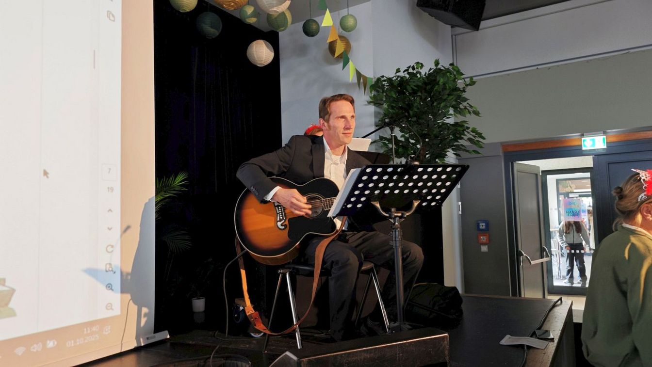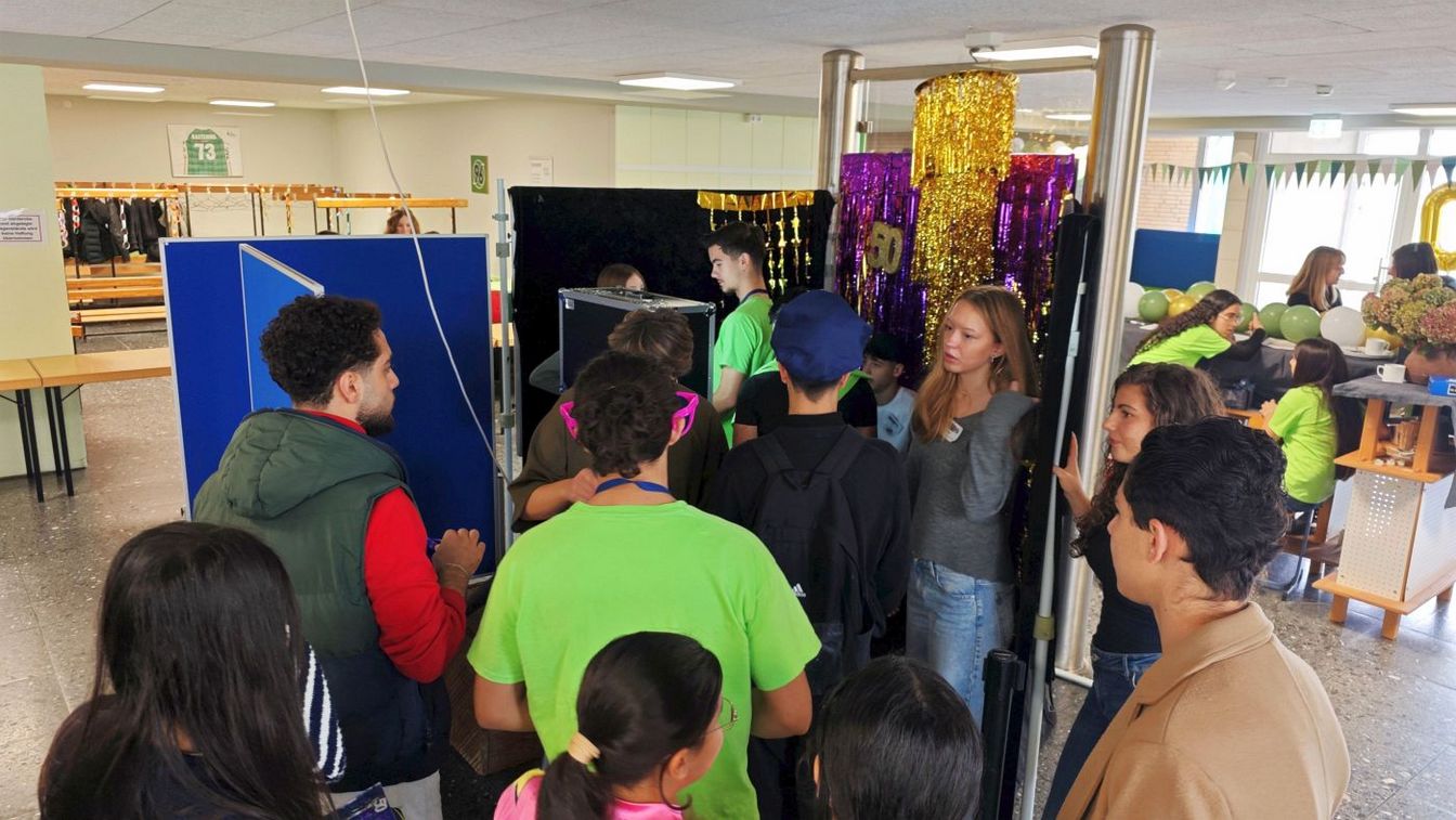 „850 Schüler und geladene Gäste haben heute Morgen gemeinsam gefrühstückt“, erklärte Christian Bohn, stellvertretender Direktor, bei einem Rundgang durch die Schule. „Die Schüler wurden durchgemischt, damit alle miteinander in Kontakt kommen konnten.“ Es wurde dekoriert und musikalische Untermalung vorbereitet – dann kam der Stromausfall. „Doch wir haben trotzdem gefeiert“, so Bohn weiter. Glücklicherweise ging der Strom zur Mittagszeit wieder an, sodass Popcorn-Maschine, Hüpfburg, Fotobox und andere Angebote doch noch in Betrieb genommen werden konnten. In der Aula wurde es sogleich musikalisch und das Rudelsingen konnte beginnen, bei dem jeder, der wollte, miteinstimmen konnte.