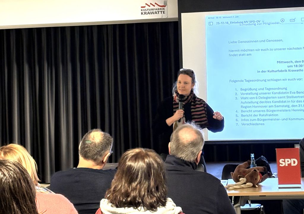 Rund 30 SPD-Mitglieder waren am Mittwoch trotz des beeindruckenden Winterwetters in die Kulturfabrik Krawatte gekommen waren. Sie nahmen wohlwollend Eva Benders Werdegang zur Kenntnis. Dieser führte sie von einem Studium der Sozialwissenschaften in Göttingen und Córdoba über die Verwaltung in Braunschweig zum Posten der 1. Stadträtin in Langenhagen und schließlich zum Amt der Dezernentin für Bildung und Kultur in Hannover.