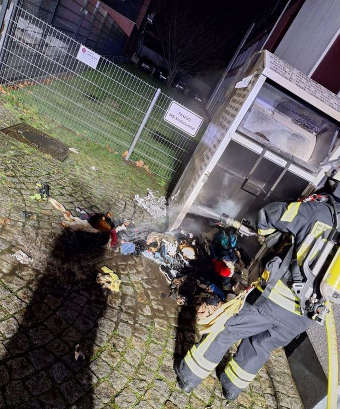 Vor dem Rathaus II stand ein Altkleidercontainer in Flammen. Ein Trupp unter Atemschutz öffnete den Container und löschte den Brand mit einem C-Rohr. Kurz darauf entdeckten die Einsatzkräfte einen weiteren Brand: Ein Papierkorb an einem Laternenmast brannte und wurde mithilfe eines Kleinlöschgeräts gelöscht.