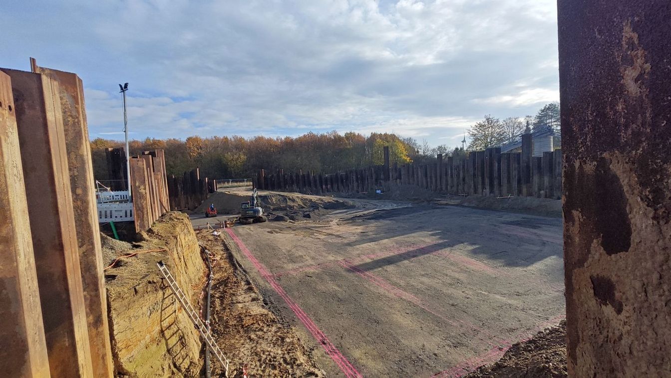 Die Vorbereitungen dazu sollen noch diese Woche beginnen, damit in der kommenden Woche die Arbeiten starten können. Pro Tag sollen dann 15 Pfähle errichtet werden. Zunächst auf der einen Seite der Baugrube, dann wird die aufgeschüttete Rampe auf der anderen Seite der Baugrube erreichtet und die Fahrzeuge arbeiten sich erneut von der Mitte bis an den Rand. Außerdem soll eine ein Meter starke Schotterschicht für die Bodenplatte aufgeschüttet werden.
