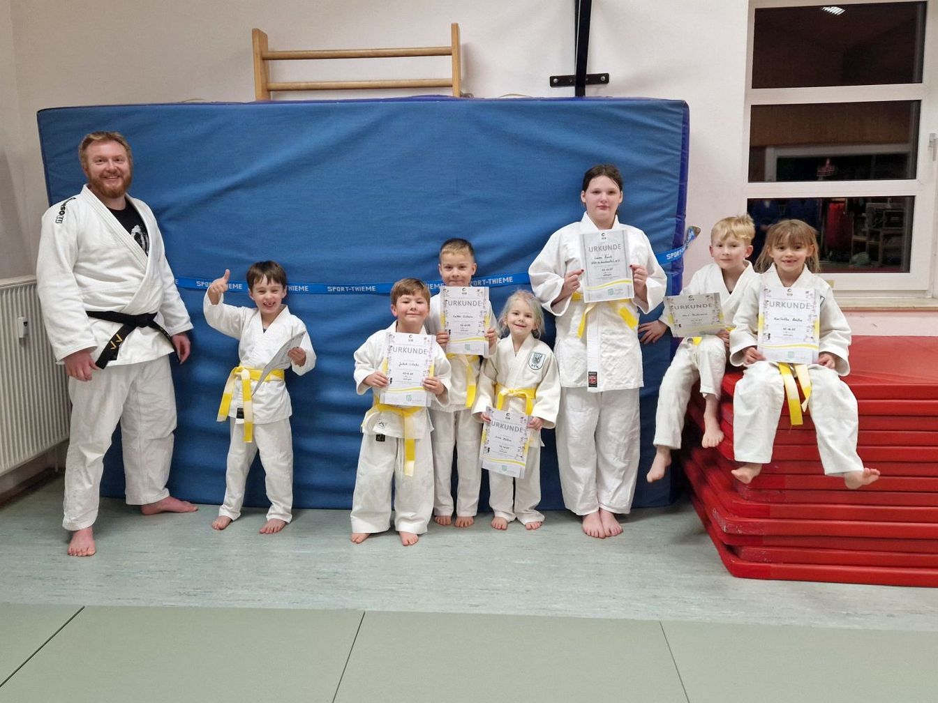 Da die Judogruppe des VSV Hohenbostel in den letzten Monaten erfreulicherweise stark gewachsen ist, wurde das letzte reguläre Training im Dezember genutzt, um auch ein wenig Farbe in die Gürtel der neuen Kinder zu bringen. Sieben Judo-Einsteiger stellten sich mutig den kritischen Blicken des Prüfers und der zuschauenden Eltern und zeigten stolz, was sie in ihren ersten Trainingseinheiten schon alles gelernt haben. Neben den ersten Judowürfen und Haltegriffen beherrschen sie auch das traditionelle Angrüßen im Judosport und kennen die dem Sport zugrundeliegenden Judowerte. Alle sieben Judoka dürfen jetzt den weiß-gelben Gürtel tragen.