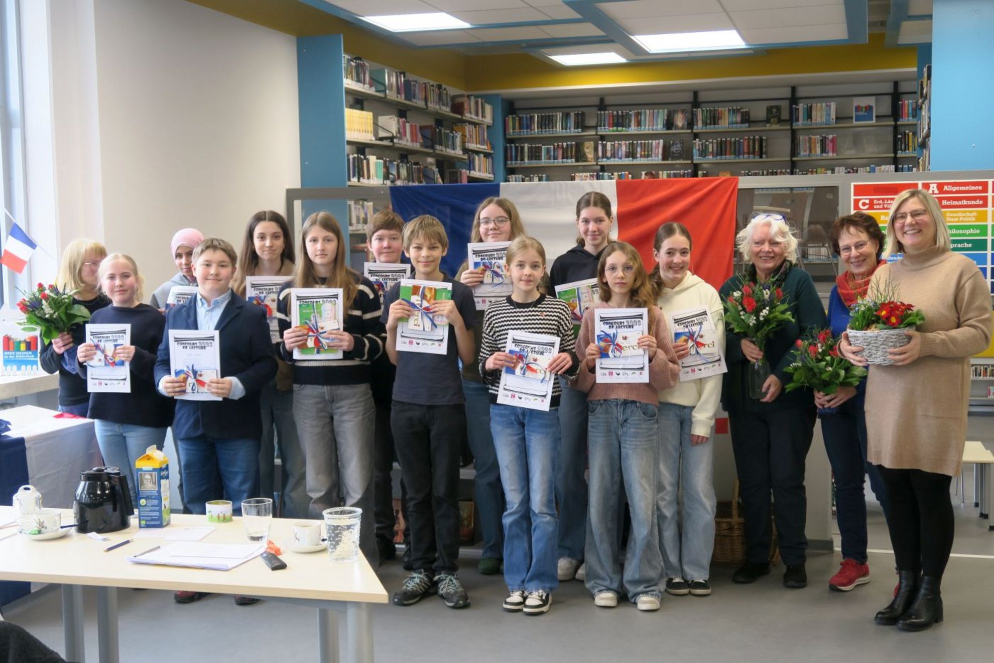 In der Großen Bibliothek wurden französische Fähnchen aufgehängt, blau-weiß-roter Blumenschmuck wurde dekoriert und in der Pausenhalle ein großes „Herzlich willkommen“-Schild zur Begrüßung der teilnehmenden Gymnasien aufgehängt.