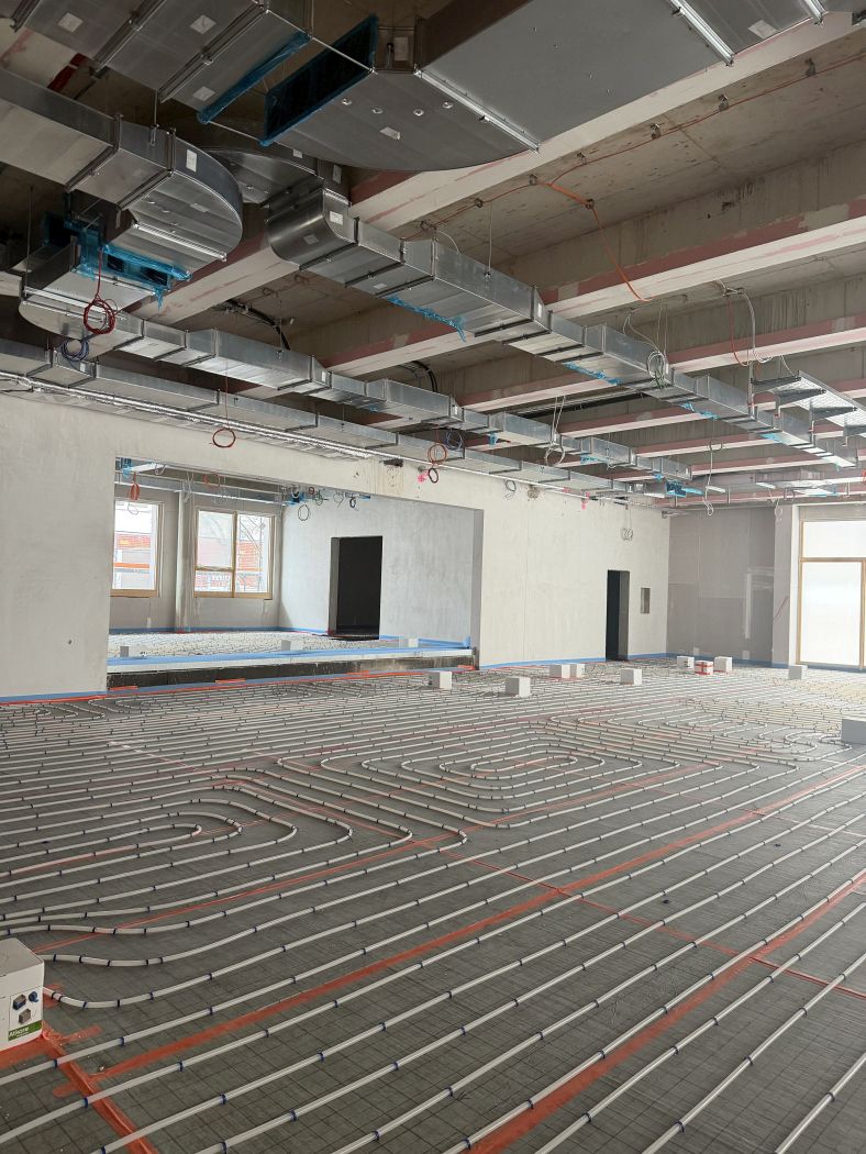 Der Neubau erfüllt hohe energetische Anforderungen und wird durch Bundesmittel gefördert. Zwei hochmoderne Wärmepumpen in Kombination mit Fußbodenheizung sorgt künftig für eine effiziente und klimafreundliche Wärmeversorgung – insbesondere auch im Bereich der Mensa, die mit eigener Küche ausgestattet sein wird.
