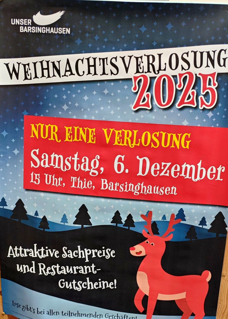 Mit Spannung darf auch die große Weihnachtsverlosung erwartet werden. Die Lose gibt es ab dem 2. November beim Einkauf in einem der teilnehmenden Fachgeschäfte in der Innenstadt. Die derzeit rund zwölf teilnehmenden Geschäfte sind durch Plakate gekennzeichnet. Auch bei den Stadtwerken Barsinghausen und im Deisterbad sind Lose erhältlich. Insgesamt werden 10.000 Lose in Umlauf gebracht, und es gibt wieder viele attraktive Preise – darunter Gutscheine für das Sporthotel Fuchsbachhotel (100 Euro), weitere Gastronomie-Gutscheine, Gutscheine von Unser Barsinghausen sowie Dauerkarten des HVB.