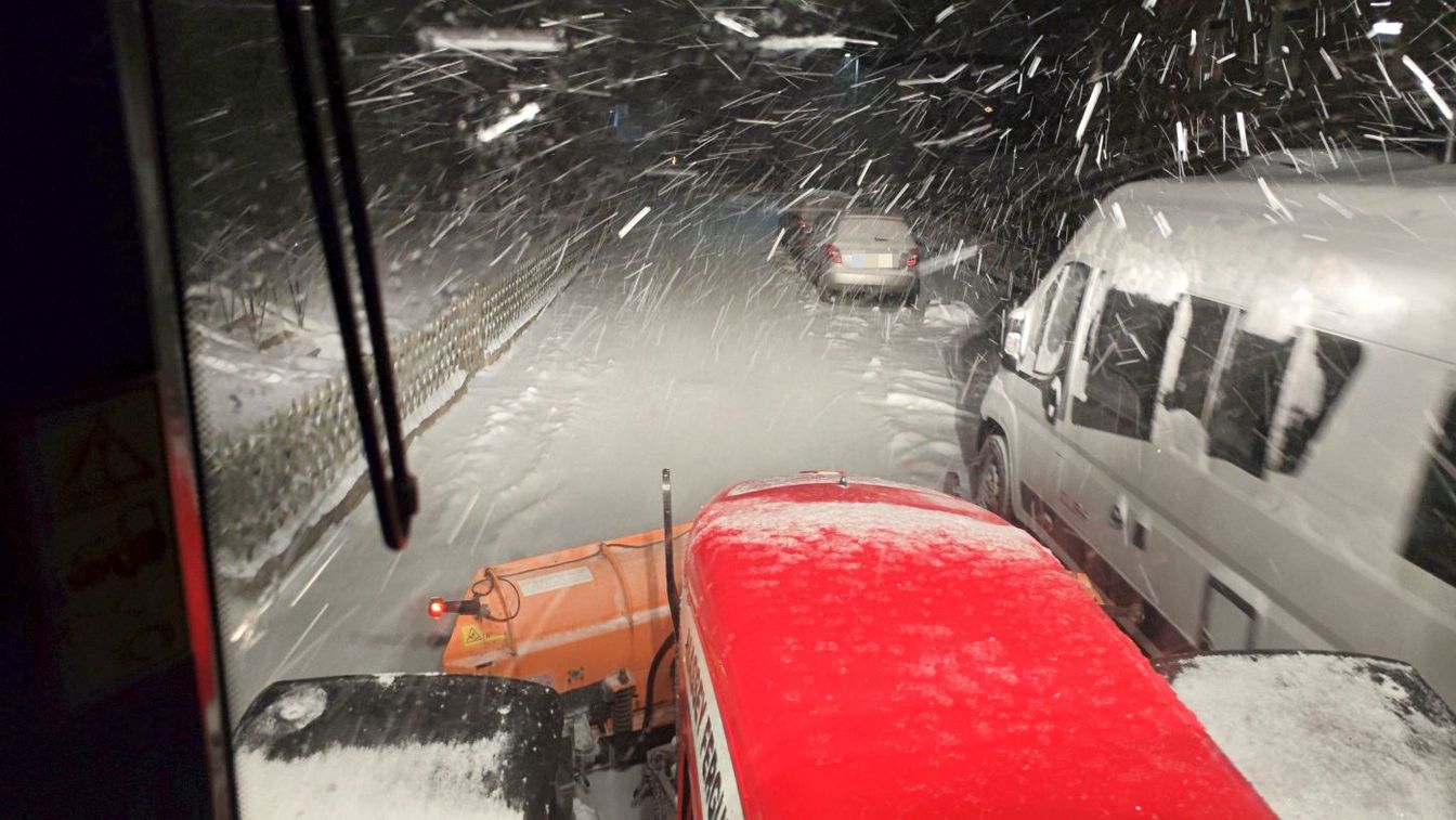 Teilweise bleiben zwischen Traktor und geparkten Autos nur wenige Zentimeter. „Man muss immer überlegen, wohin man den Schnee schiebt. Wir wollen den Bürgern ja nicht die Einfahrten zuschieben. Mitnehmen kann ich den Schnee aber auch nicht“, erklärt der Fahrer.
