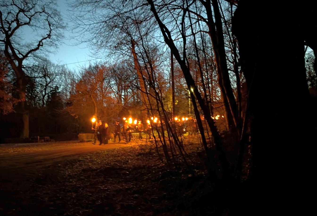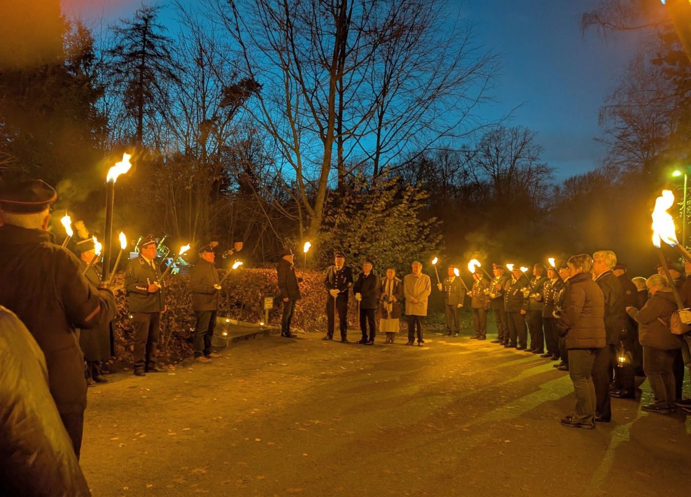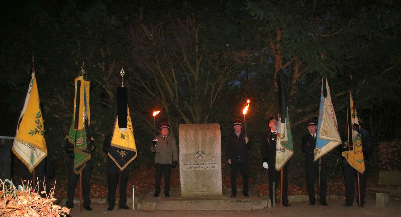 Im Schein von Fackeln und Grubenlampen setzte sich ein Schweigemarsch in Bewegung – ein beeindruckendes und atmosphärisches Bild in der einbrechenden Dunkelheit. Ziel war der Gedenkstein, an dem der offizielle Teil der Zeremonie stattfand.