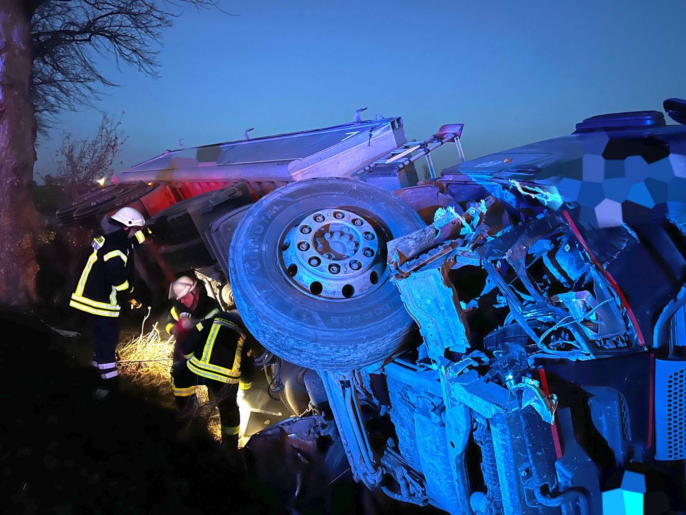 Beim Eintreffen der Einsatzkräfte bestätigte sich die Lage: Ein Sattelzug, der die B3 in Richtung Elze befuhr, war aus bislang unbekannter Ursache nach links von der Fahrbahn abgekommen, mit einem Baum kollidiert und schließlich auf der Seite im Graben zum Liegen gekommen.