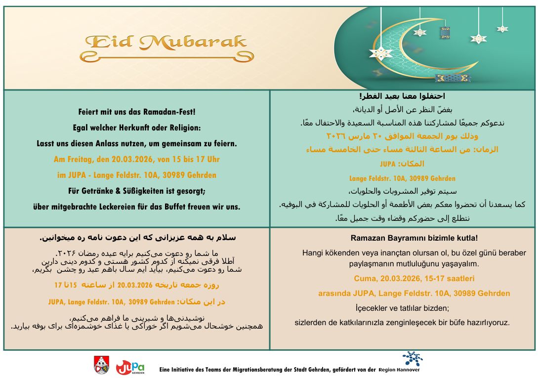 Gehrden. Das Team der Migrationsberatung der Stadt Gehrden lädt auch in diesem Jahr wieder zum gemeinsamen Ramadan-Fest ein. Die Veranstaltung findet am Freitag, 20. März 2026, von 15 bis 17 Uhr im Jugendpavillon (Jupa) in der Langen Feldstraße 10a statt.