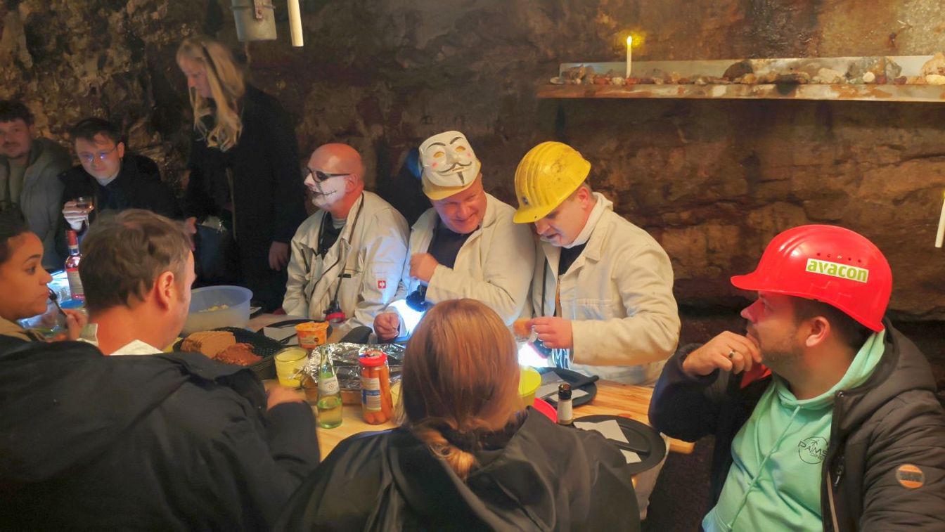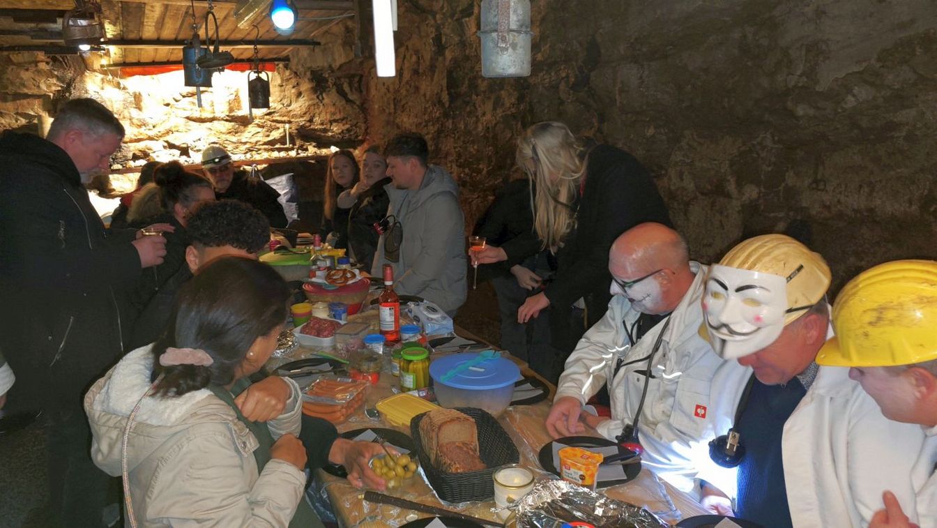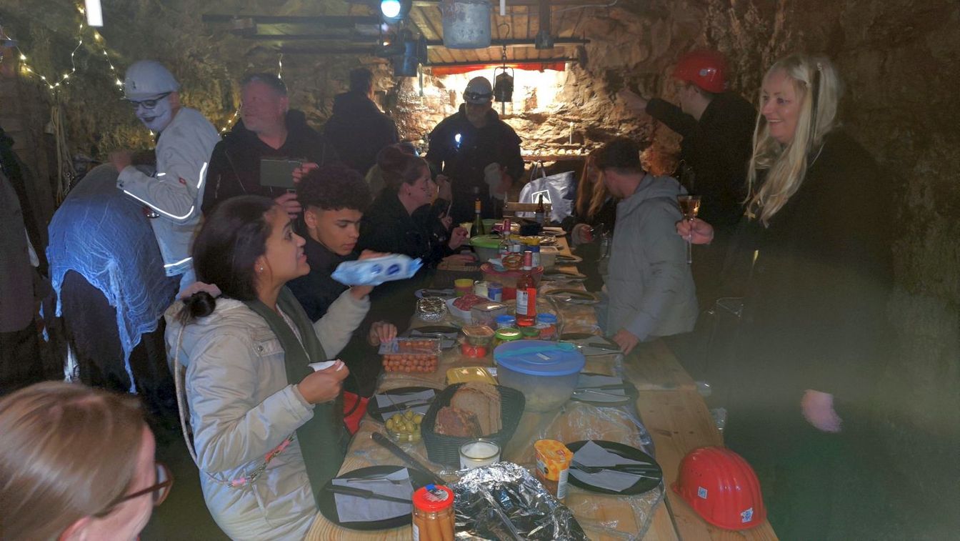 Aufgelockert wurde der Gang durch den Stollen durch (etwas eklige) Spiele, die die Teilnehmer gerne mitmachten. Beendet wurde die Halloween-Tour mit einem gemeinsamen Essen in der sogenannten Sprengstoffkammer des Stollens. Hier gab es dann auch ein Bier von der 405er Brauerei und alkoholfreie Getränke vom Palm’s Diner.