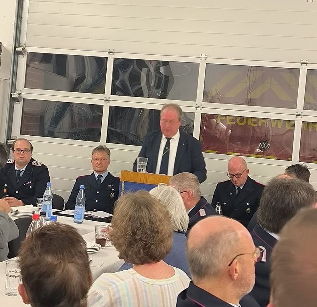 Bürgermeister Henning Schünhof würdigte in seinem Grußwort das außergewöhnliche Engagement der Feuerwehr. 32 aktive Mitglieder seien für ein kleines Dorf eine stolze Zahl. Zudem stellte er in Aussicht, dass zeitnah eine Begehung der Feuerwehrliegenschaft stattfinden soll, um Möglichkeiten für einen Unterstand für den Mannschaftstransportwagen zu prüfen.
