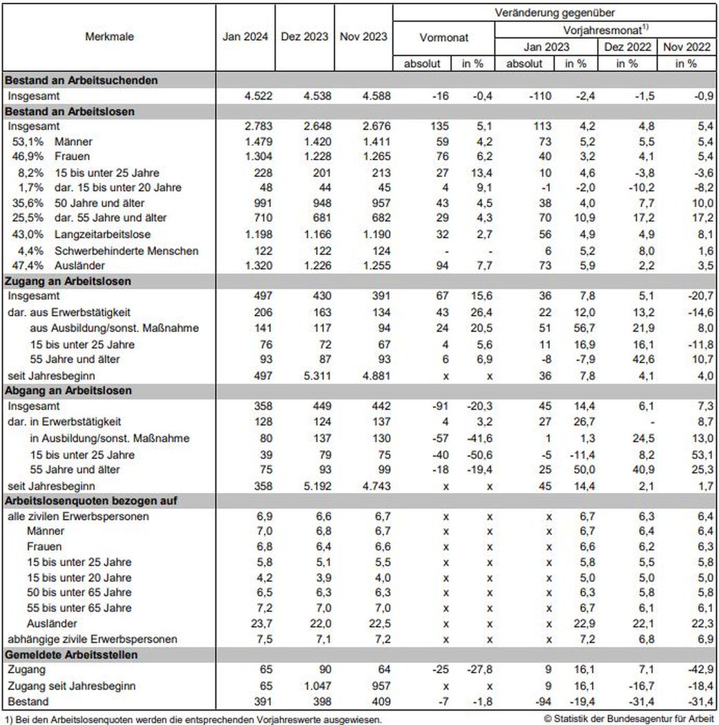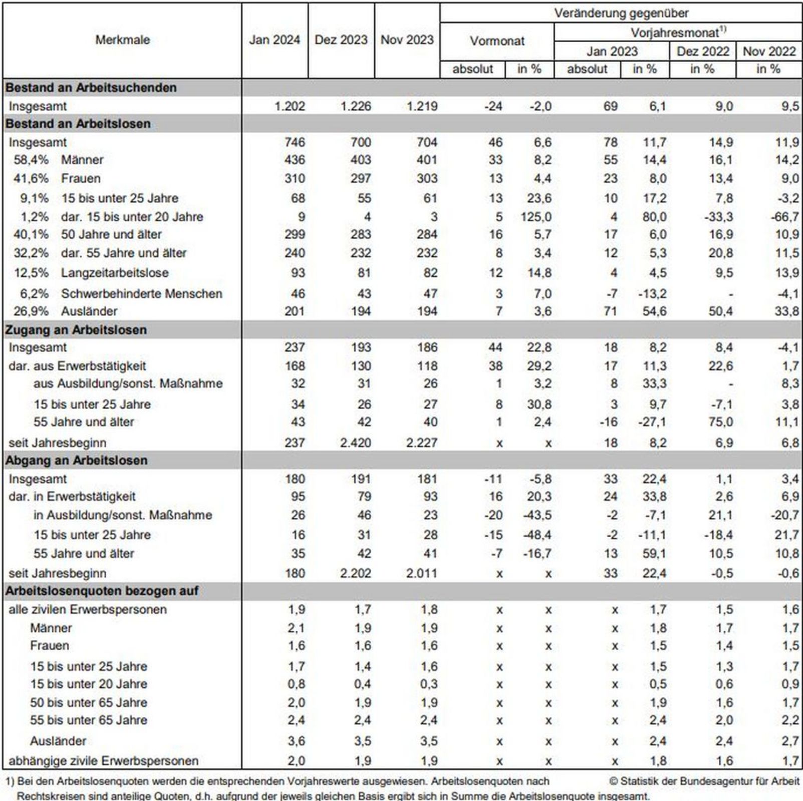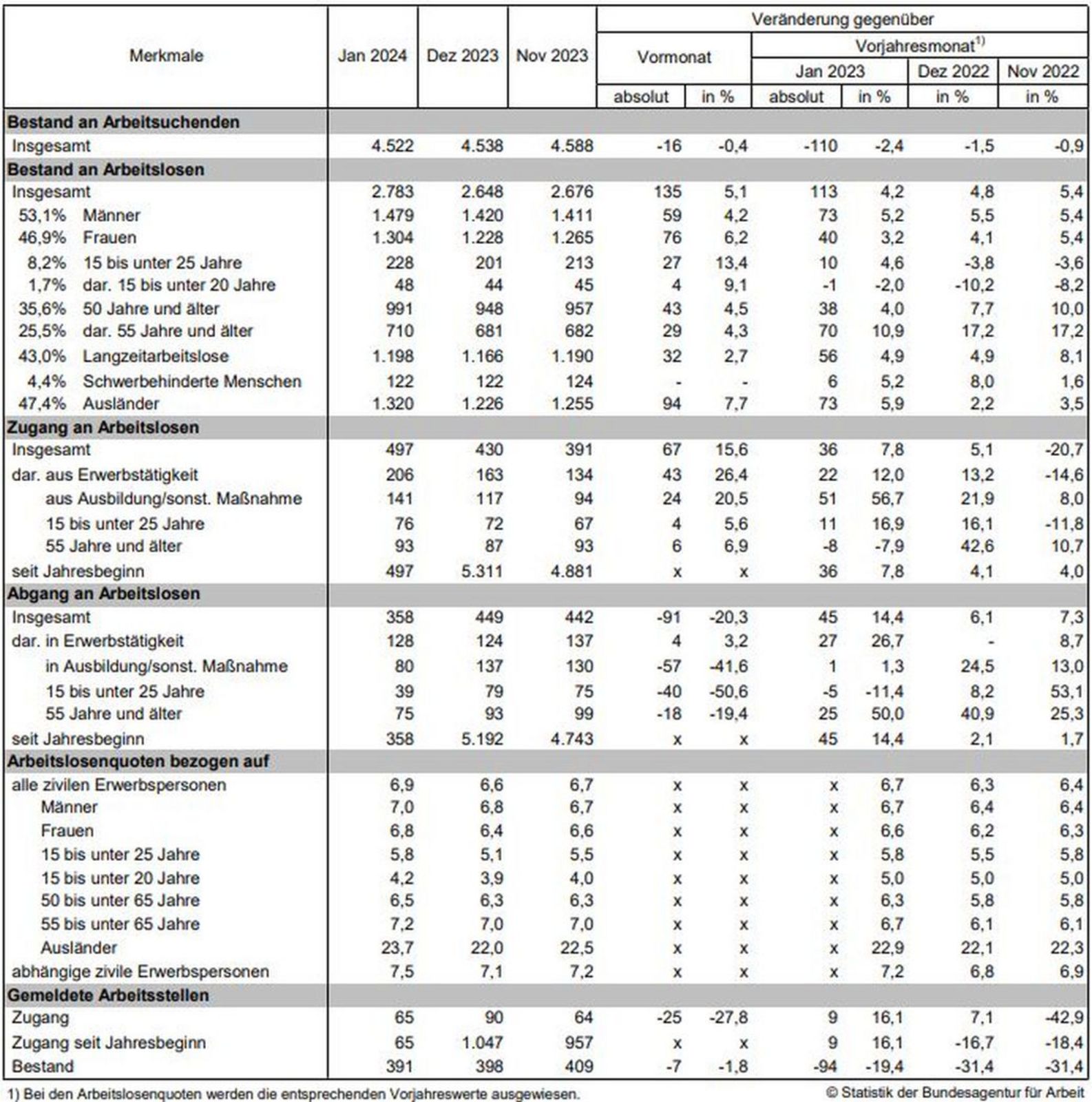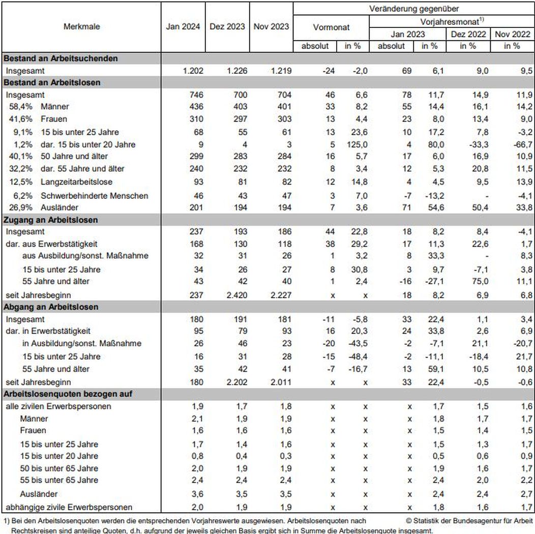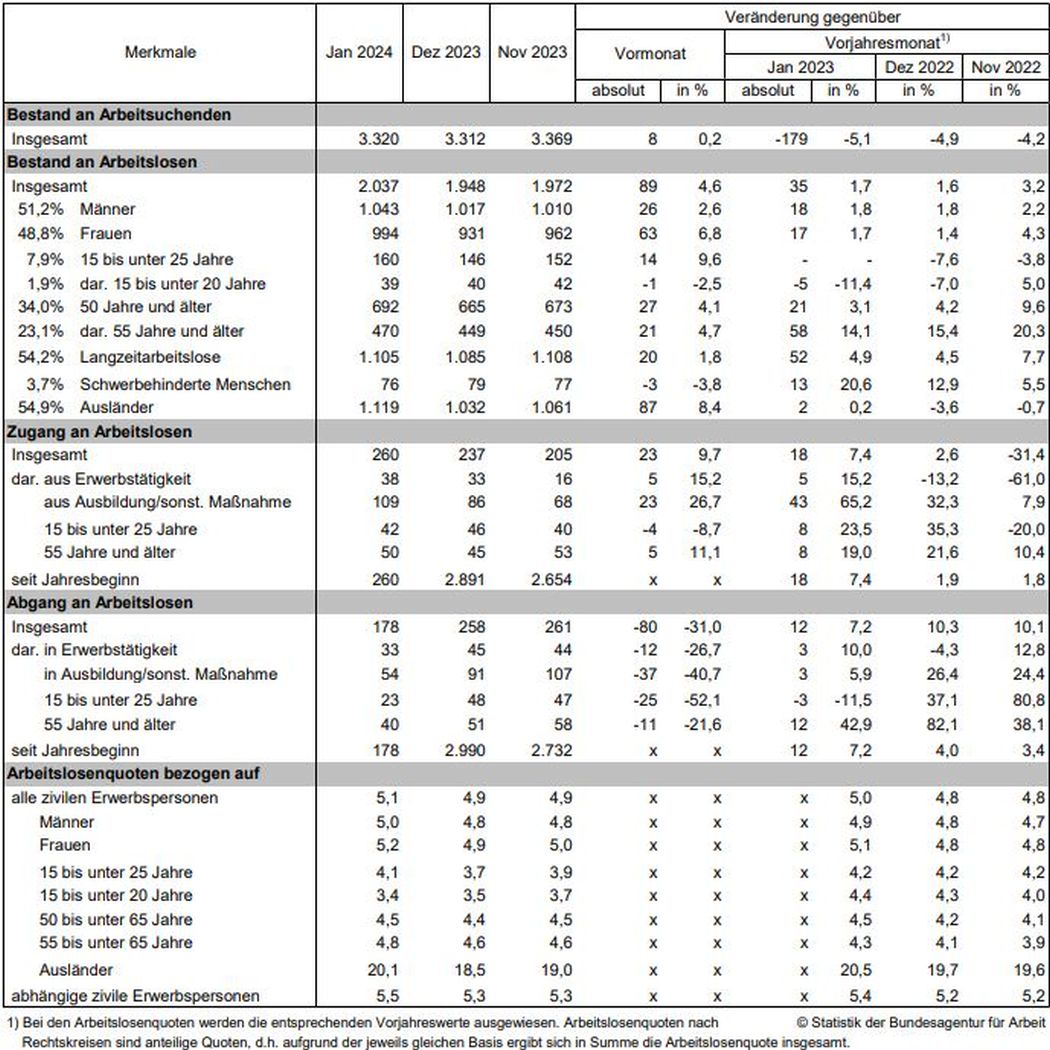 Die Arbeitslosigkeit ist im Rechtskreis SGB II von Dezember auf Januar um 89 auf 2.037 Personen gestiegen. Das waren 35 Arbeitslose mehr als vor einem Jahr. Die anteilige SGB II-Arbeitslosenquote auf Basis aller zivilen Erwerbspersonen betrug im Januar 5,1%; vor einem Jahr belief sie sich auf 5,0%. Dabei meldeten sich 260 Personen (neu oder erneut) arbeitslos, 18 mehr als vor einem Jahr. Gleichzeitig beendeten 178 Personen ihre Arbeitslosigkeit, 12 mehr als vor einem Jahr.