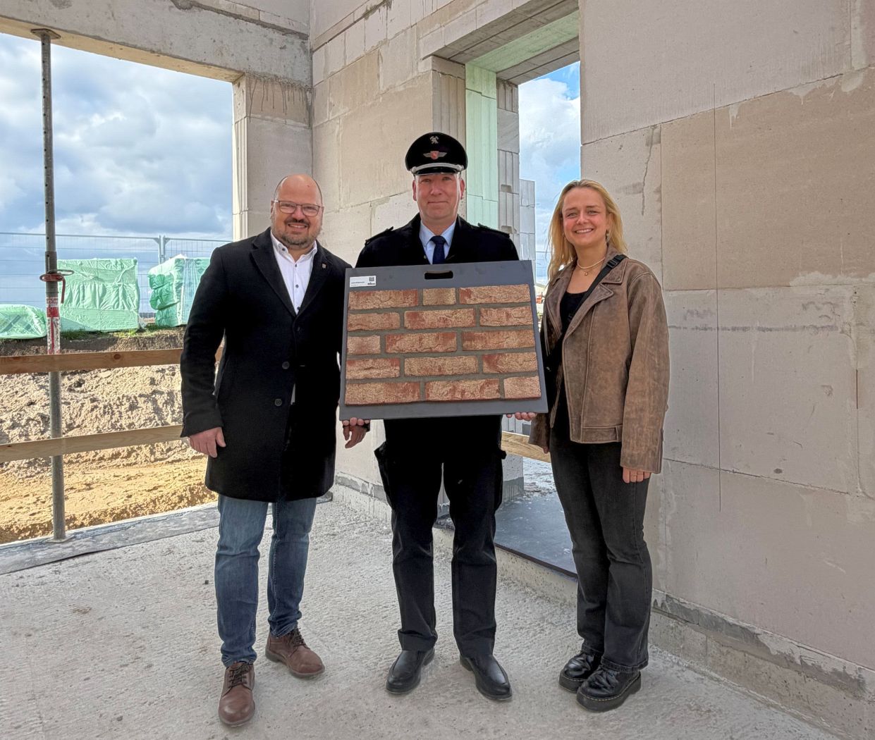 Mit Maurerkelle und Mörtel Bürgermeister Kai Eggert, Ortsbrandmeister Frank Bezdiak und Hanke Bau Geschäftsführer Olaf Küpper versenken die traditionelle Zeitkapsel im Gemäuer. Quelle: Stadt Laatzen.