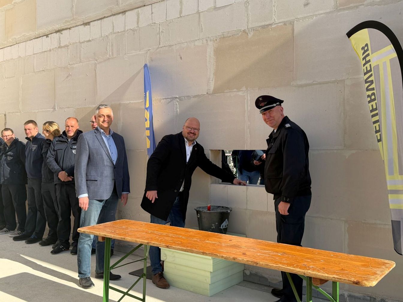 Bürgermeister Kai Eggert: "Dieser Grundstein wird gelegt im Vertrauen auf die Zukunft und den unermüdlichen Einsatz unserer Feuerwehr." Olaf Küpper, Geschäftsführer des Generalunternehmers Hanke Bau- und Projektentwicklungs GmbH: "Möge diese Baumaßnahme sicher und unfallfrei für alle Beteiligten zu Ende gebracht werden." Ortsbrandmeister Frank Bezdiak: "Möge dieses Feuerwehrhaus stets ein Ort der Sicherheit, Kameradschaft und Einsatzbereitschaft sein."