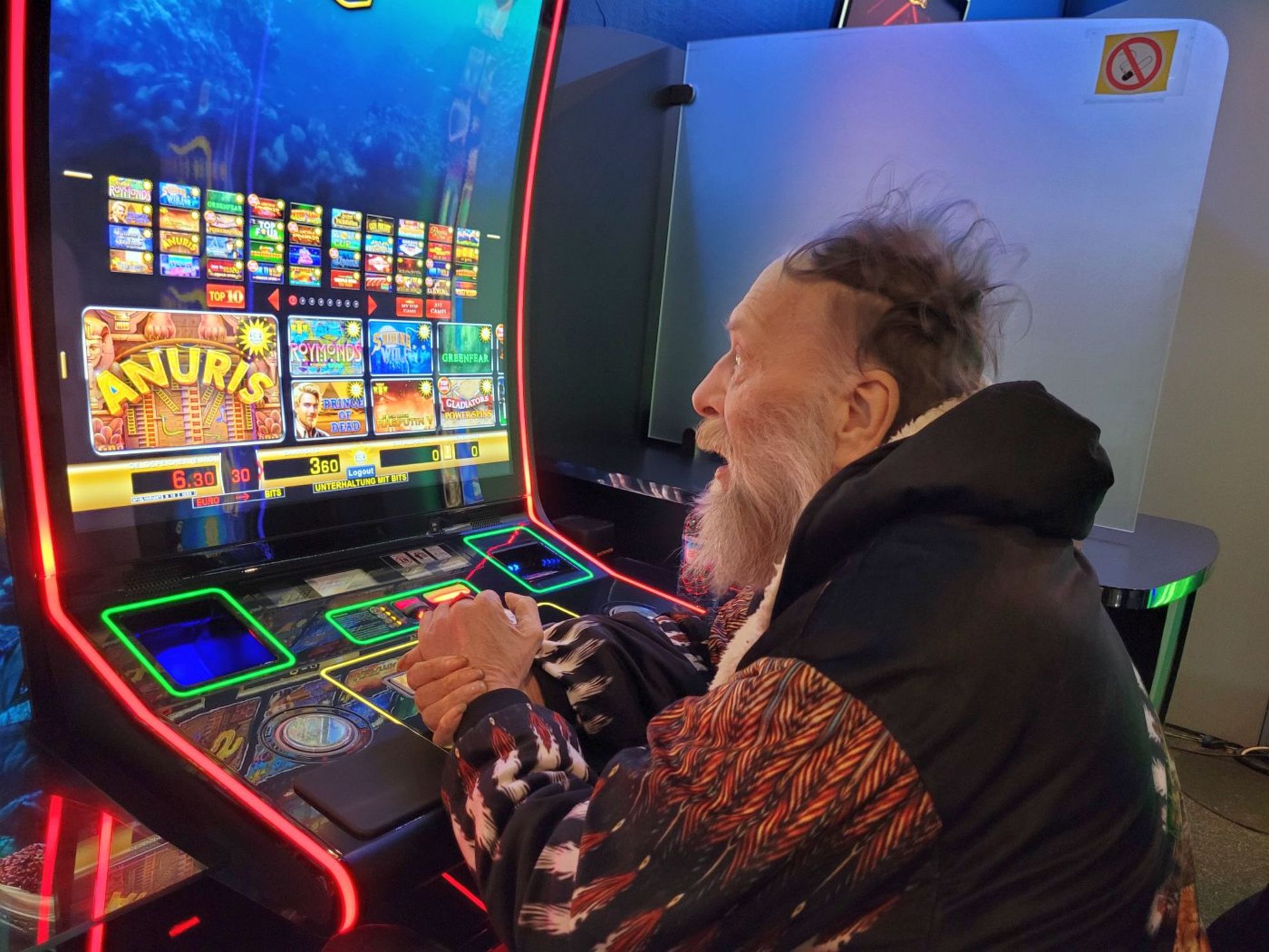Doch nicht nur im Kiosk ist "Carlo" gerne gesehen, auch in der Spielhalle Fun City“ ist der Krebspatient beliebt: Zur Begrüßung wird er vom Personal geherzt und gedrückt. Die Wiedersehensfreude ist riesig. Natürlich auch bei "Carlo", der hier früher zweimal die Woche vorbeigeschaut, gezockt hat. Im WüWa-Tragestuhl lässt er sich direkt vor die Spielautomaten fahren, beginnt zu spielen. Vergisst die Welt um sich herum. Und Gott sei Dank auch seine Schmerzen. Ist frohen Mutes. Seine Schwester Linda, die Geburtstag hat und als Reisebegleitung mit auf Wunschfahrt gegangen ist, versucht sich ebenfalls am Automaten. Gewinnt sofort 40 Euro. Anfängerglück. Das Geld wandert in den Wünschewagen-Spendentopf.