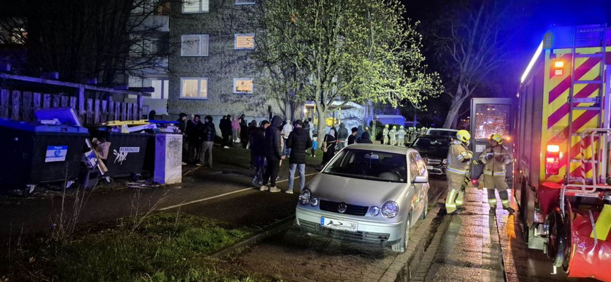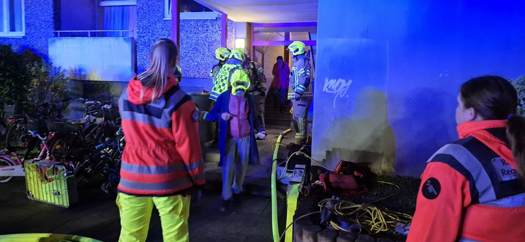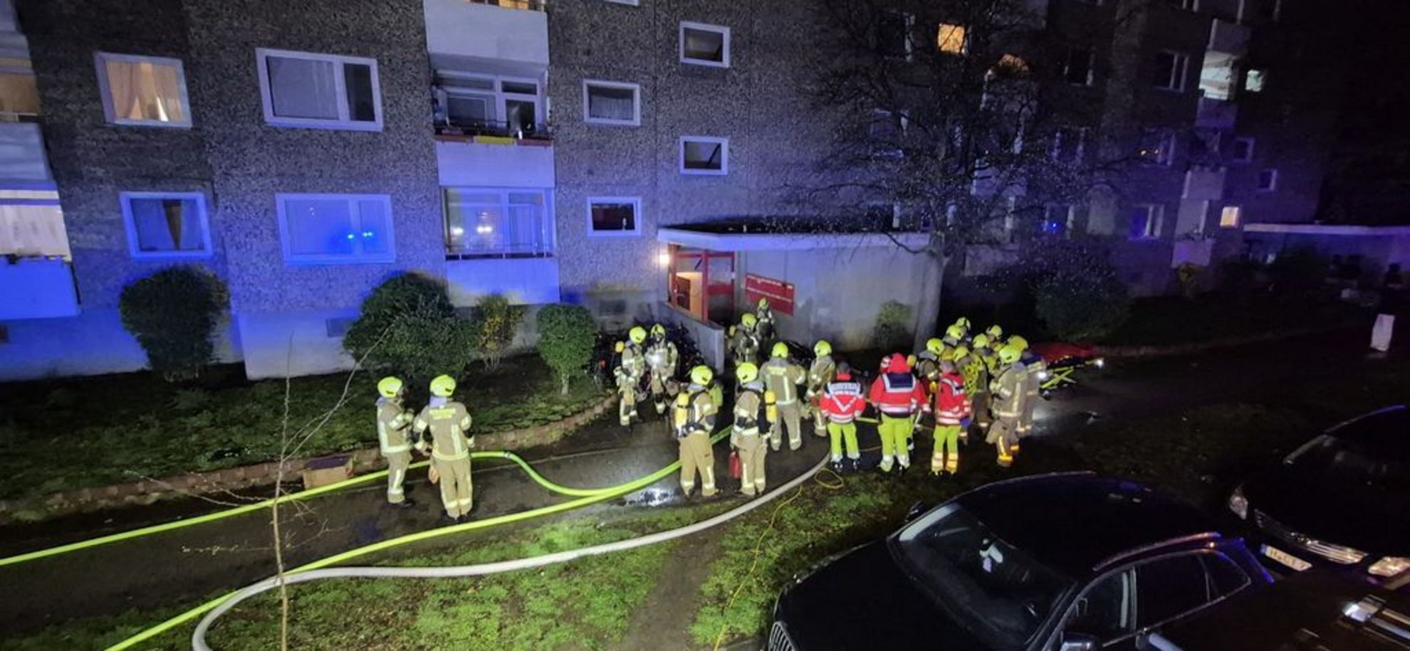Einsatzkräfte vor dem vom Kellerbrand betroffenen Mehrfamilienhaus. Foto: André Oestreich.