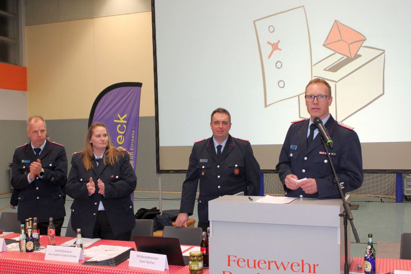 Sven Sachse ist seit zwölf Jahren als Ortsbrandmeister im Amt. Dafür dankte Gemeindebrandmeister Jörg Ommen noch einmal. Eigentlich wollte Sachse das Amt nicht länger bekleiden. „Aber der Rückhalt von Kameraden und Familie sowie die Tatsache, dass es sehr viel Spaß macht und ich die angefangenen Projekte gerne noch zu Ende führen würde, lassen mich zu einer Wiederwahl antreten“, so Sachse. Ohne Gegenkandidaten wurde Sachse daher erneut mit großer Mehrheit in das Amt gewählt. Sein Stellvertreter Christof Reichelt dankte Sachse für die gute Zusammenarbeit in den letzten elf Jahren und freute sich auf eine weitere Zusammenarbeit.