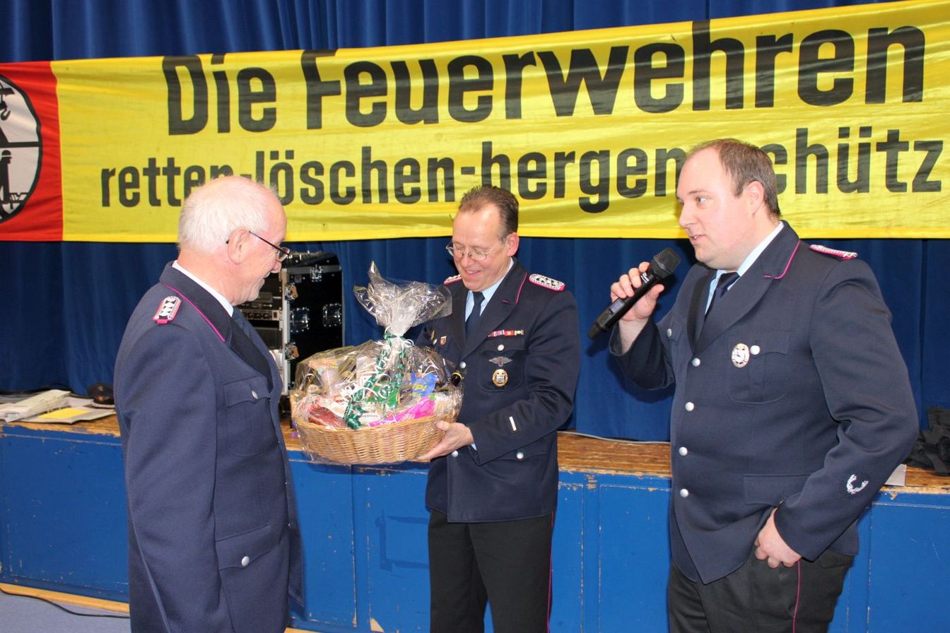 Dank für 35 Jahre als Kassierer: v.l. Jörg Trampenau mit Ortsbrandmeister Markus Plackner und dessen Stellvertreter Helmut Voshage.