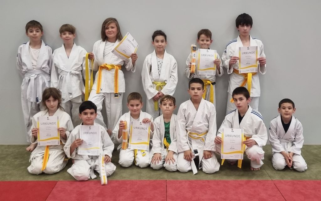 12 Kinder und Jugendliche traten zur Prüfung zu gelb-orange an, bei der sie umfangreiche Techniken im Stand und im Boden zeigten: Bendt Busch, Lejla Calacovic, Jasper Borth, Noah und Luca Jeske, David und Aaron Bersuch, Abdul und Umar Sadulaev, Can Özer. Aus der Fortgeschrittenen- und Erwachsenengruppe waren Karol Jachim und Leander Margraf für die Prüfung zu gelb-orange dabei.