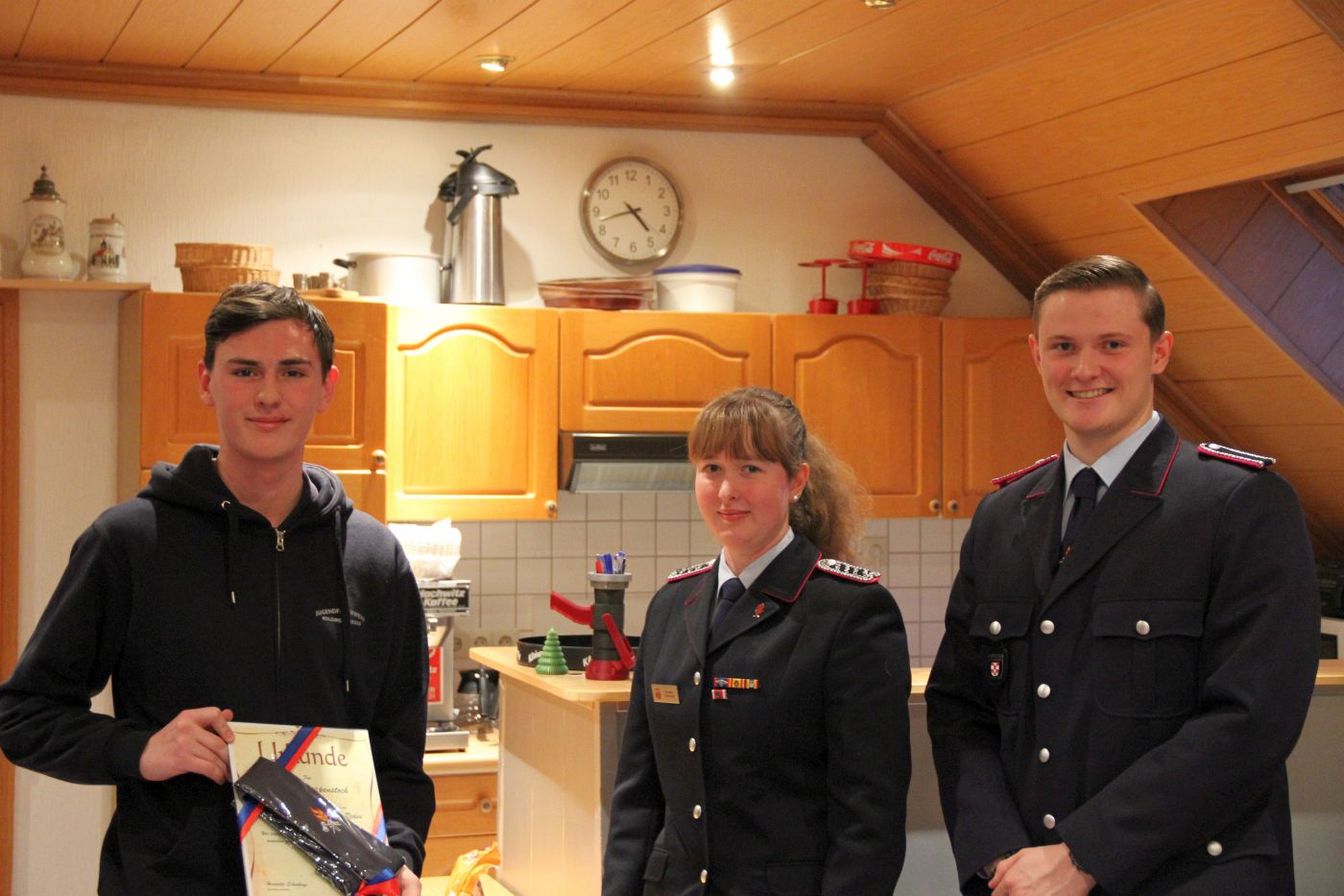 Im Anschluss an den Bericht wurde Lennart Hoppenstock aus der Jugendfeuerwehr in die Einsatzabteilung der Feuerwehr Koldingen verabschiedet. Zum Abschied erhielt er ein kleines Präsent aus den Händen von Henriette Schnehage und Fabian Prey.