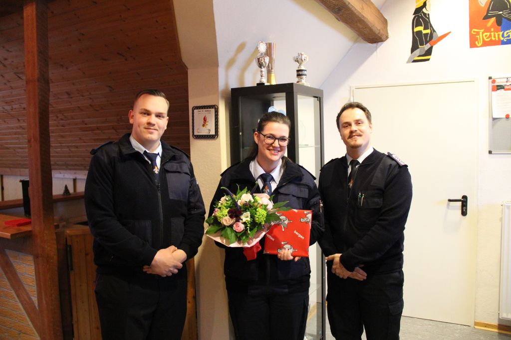 Nach seinem Bericht verabschiedete diDio Marina und Henrike in die Einsatzabteilung. Sie haben mit 16 Jahren das Eintrittsalter für die aktive Feuerwehr erreicht. Beide erhielten aus den Händen von diDio ein Abschiedsgeschenk. Für eine weitere Person hatte diDio noch ein Präsent. Stephanie Jänsch, Vorgängerin im Amt erhielt als Anerkennung von diDio und seinem neuen Stellvertreter, Adrian Rausch ebenfalls ein Geschenk.