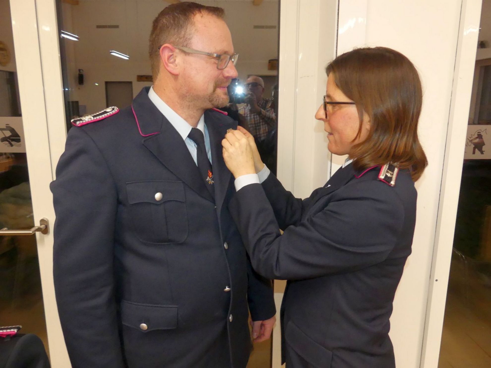 Für zehnjährige Tätigkeit ehrte Faber den Musiker Tim Fiebich (Altsaxophon) mit der Ehrennadel in Altgold. Für 30-jährige fördernde Tätigkeit wurde Werner Wahoff mit der Ehrennadel in Gold ausgezeichnet.