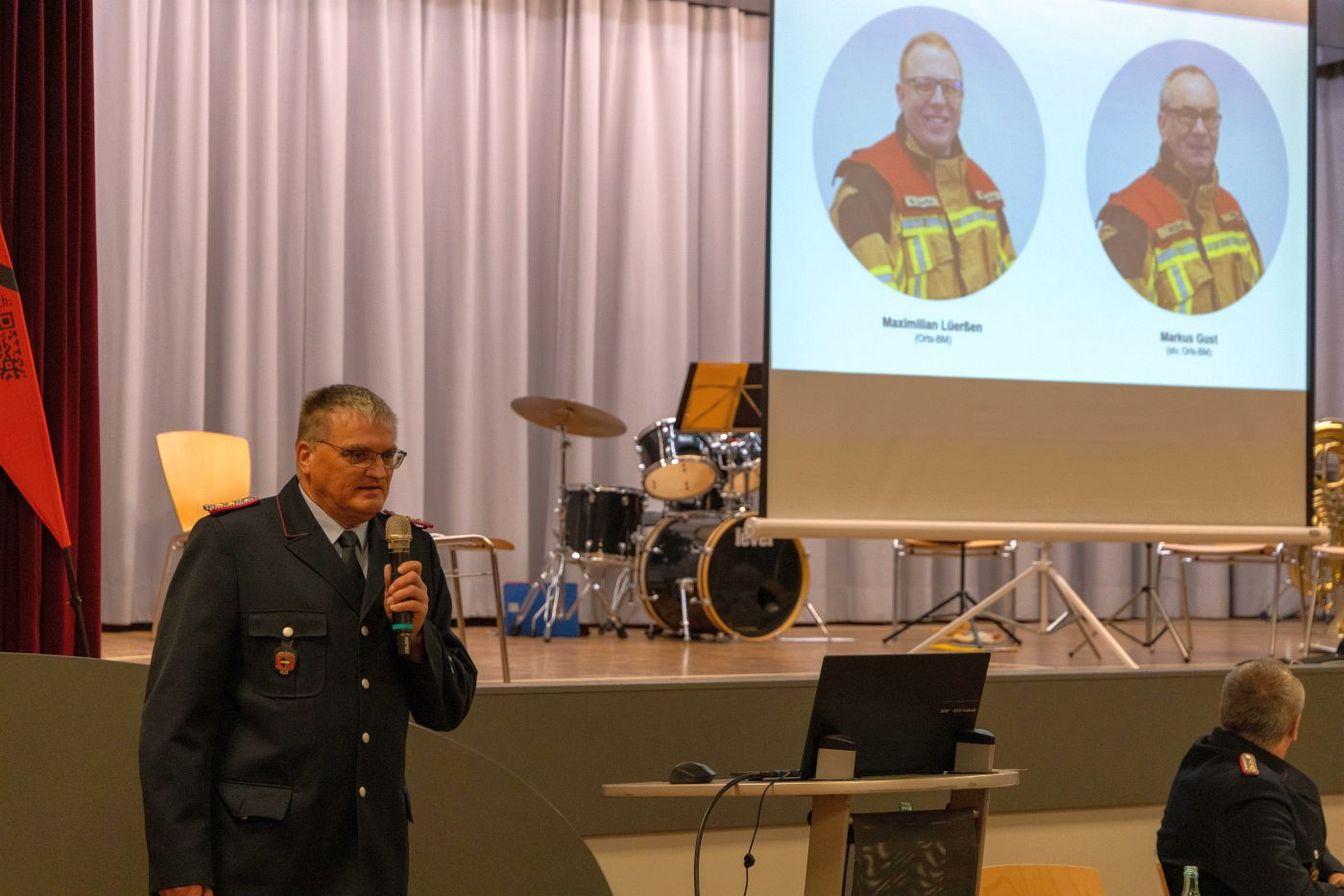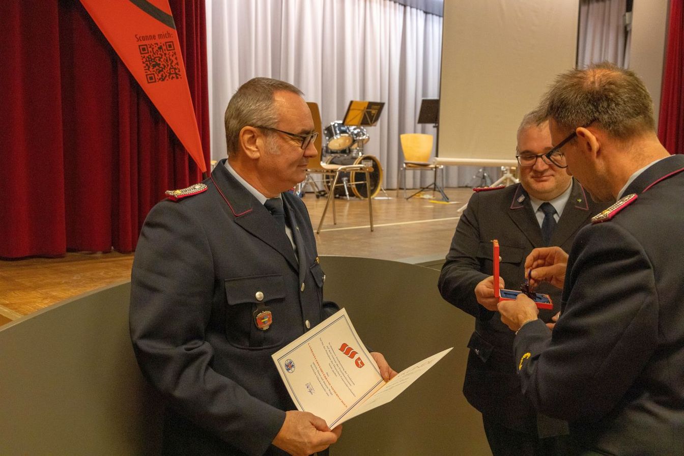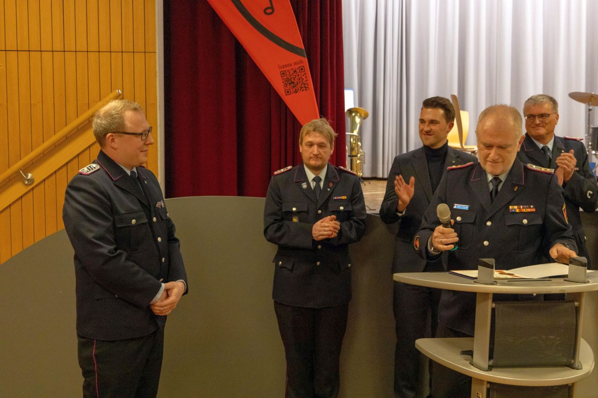 Im Rahmen der Versammlung wurden zahlreiche Ehrungen und Beförderungen ausgesprochen. Ronald Bischoff wurde für 25 Jahre Mitgliedschaft geehrt. Markus Gust erhielt das Feuerwehrehrenkreuz in Bronze, verliehen durch Kristof Schwake.