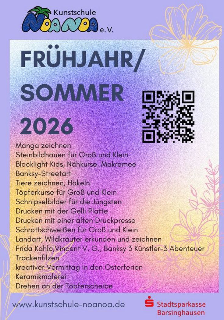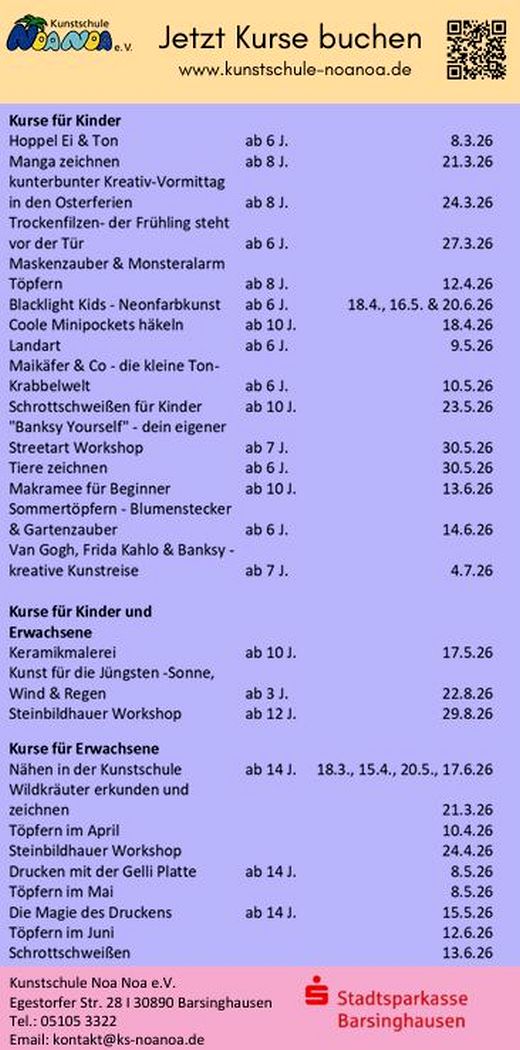 Barsinghausen. Die kreative Saison beginnt! Die Kunstschule Noa Noa präsentiert ihr neues Frühjahr- und Sommerprogramm 2026 – vielfältig, inspirierend und ab sofort online einsehbar und buchbar. Das Programm richtet sich an Kinder, Jugendliche und Erwachsene gleichermaßen und lädt dazu ein, künstlerische Techniken zu entdecken, kreativ zu experimentieren und gemeinsam künstlerisch aktiv zu werden.