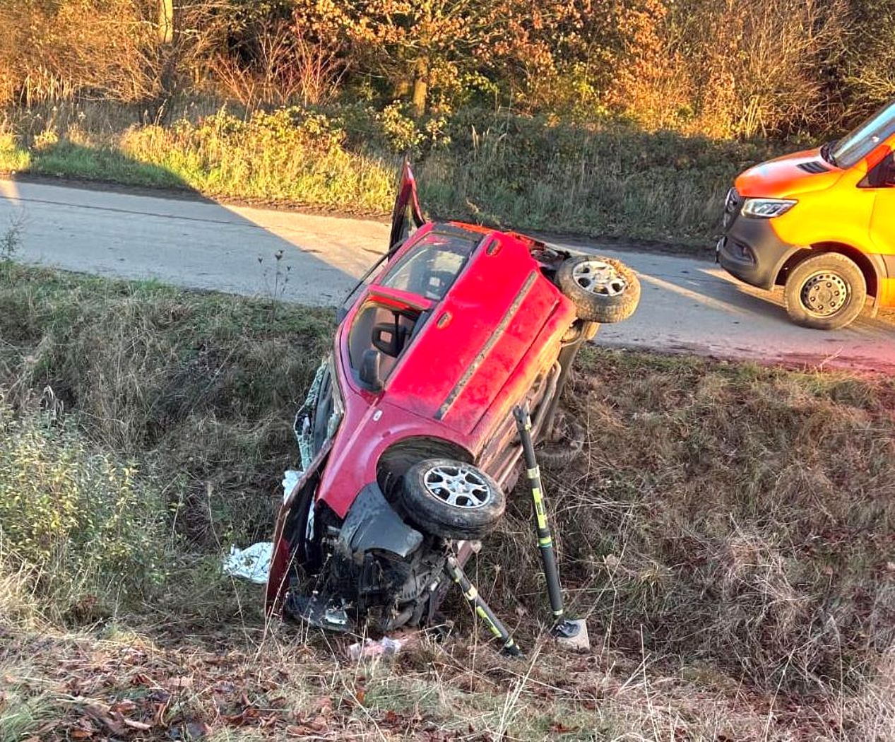Vor Ort stellte sich heraus, dass ein Fahrzeug mit zwei Insassen verunfallt war und seitlich zum Liegen gekommen war. Beide Personen erlitten mittelschwere Verletzungen. Entgegen der ersten Meldung waren sie nicht eingeklemmt, jedoch im Fahrzeug eingeschlossen. Die Feuerwehr sicherte den Pkw und entfernte die Windschutzscheibe, um die beiden Insassen schonend zu befreien und dem Rettungsdienst zu übergeben.