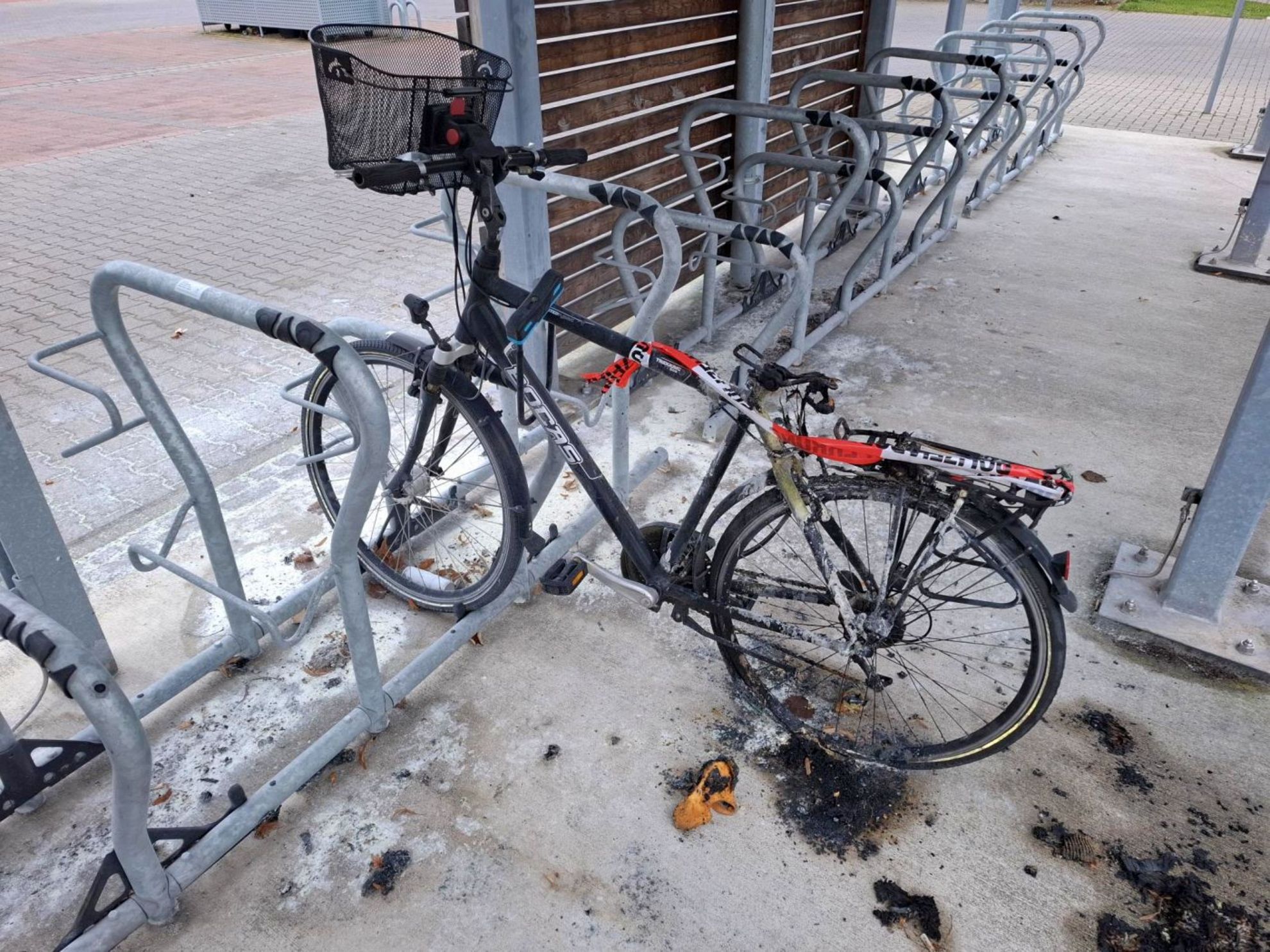 Unklar ist, wie das Fahrrad in Brand geraten ist…. (kein Elektrorad). Quelle: Henning Brüggemann.