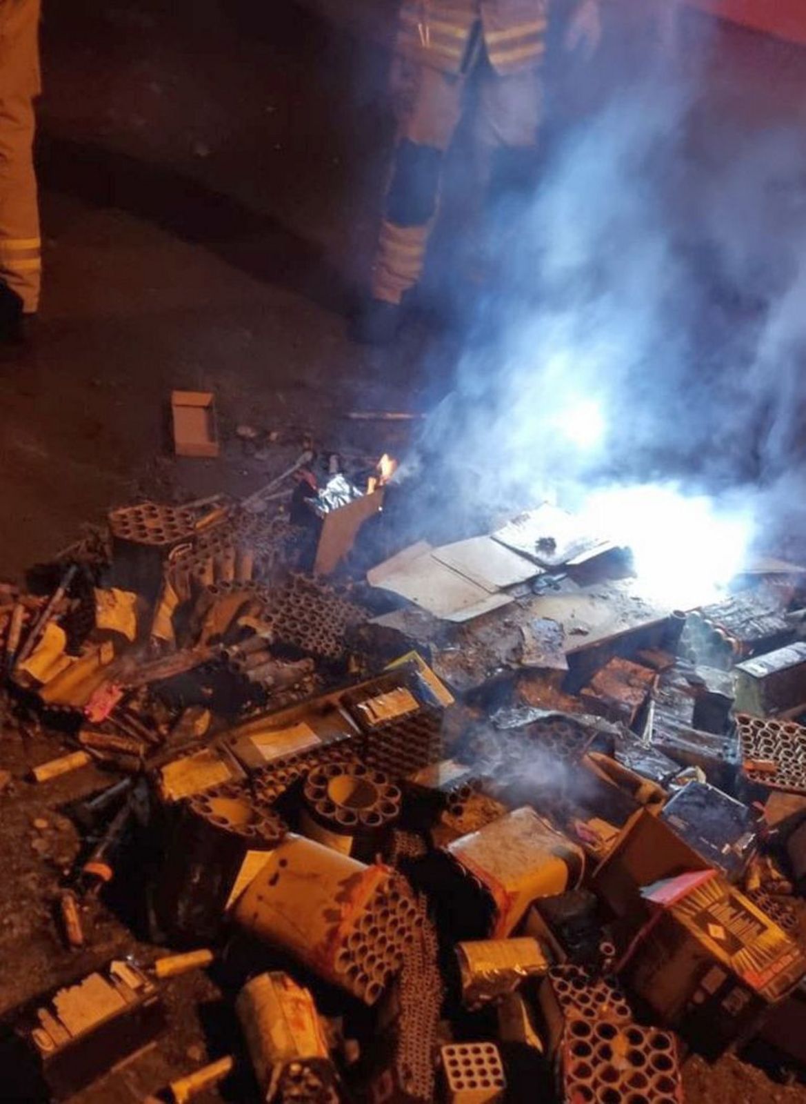 Zum letzten Einsatz dieser Nacht wurde die Ortsfeuerwehr Laatzen um 2.56 Uhr alarmiert. Im Kreuzungsbereich Debberode / Lange Weihe brannten am Straßenrand zusammengetragene, abgefeuerte Feuerwerksbatterien. Feuerwehrwehrleute unter Atemschutz löschten auch diese mit Wasser ab.