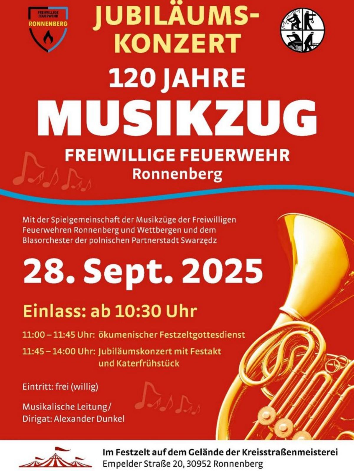 Ronnenberg. Der Musikzug der Freiwilligen Feuerwehr Ronnenberg blickt in diesem Jahr auf 120 Jahre Vereinsgeschichte zurück. Aus diesem Anlass lädt die Feuerwehr am Sonntag, 28. September, zu einem festlichen Konzert ins große Festzelt ein, das auf dem Grundstück der Kreisstraßenmeisterei in der Empelder Straße aufgebaut wird..