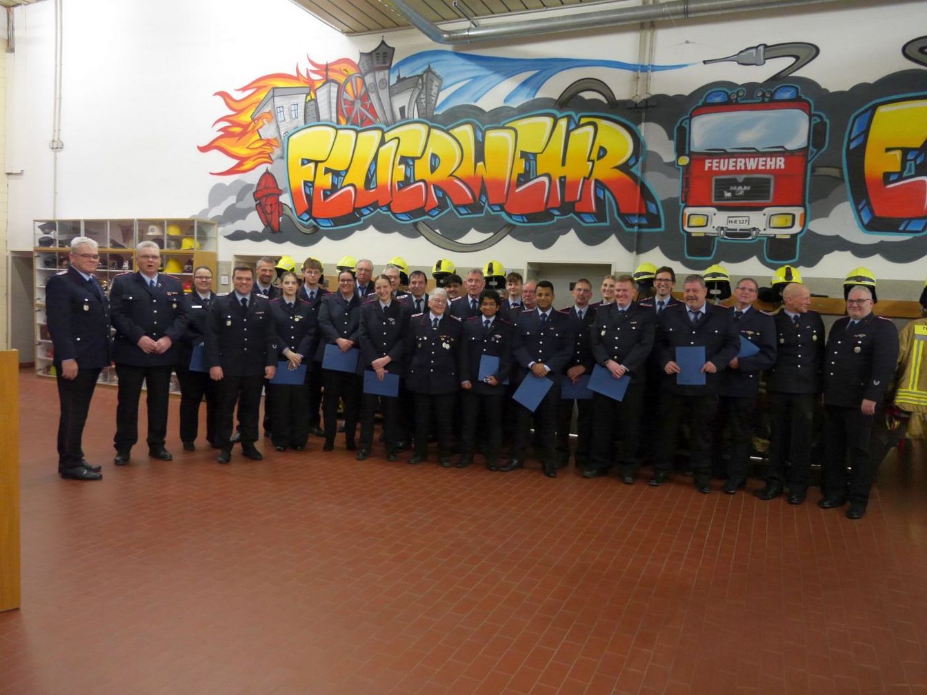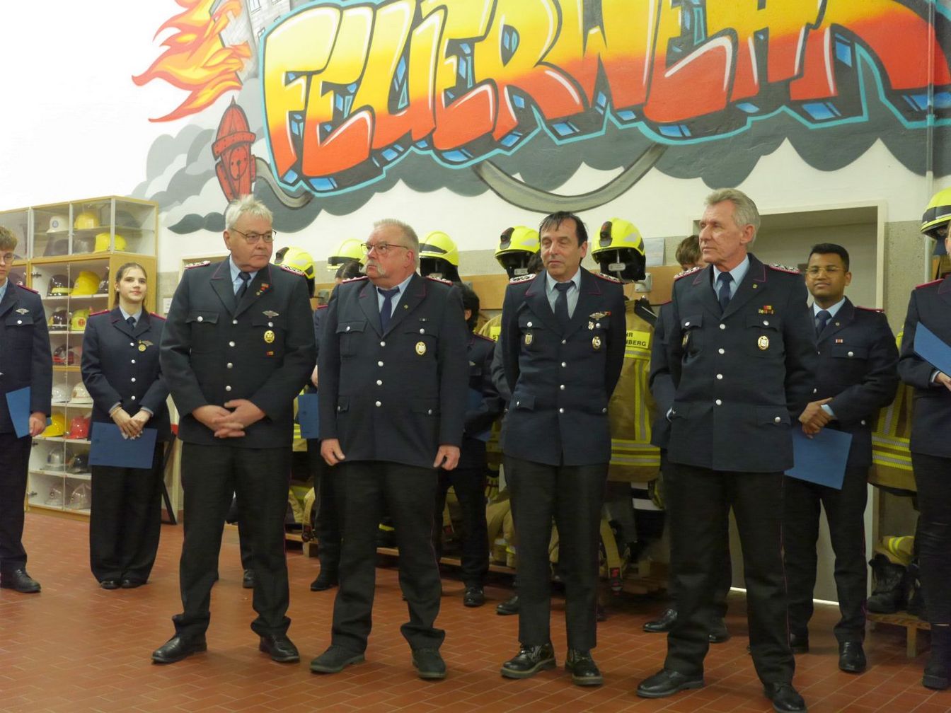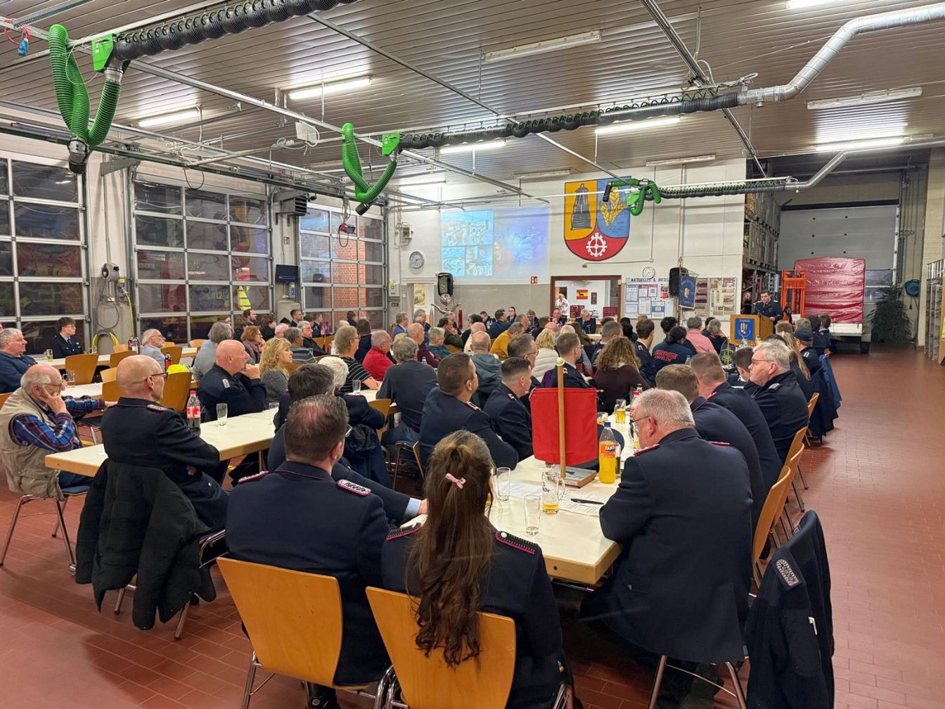 Ein weiterer Höhepunkt des Abends waren die Ehrungen und Beförderungen im Rahmen der neuen Feuerwehrverordnung. Mehrere Kameradinnen und Kameraden wurden befördert, zudem wurden Christa Schrader für 40 Jahre und Reinhold Wuck für 60 Jahre Mitgliedschaft in der Feuerwehr geehrt.