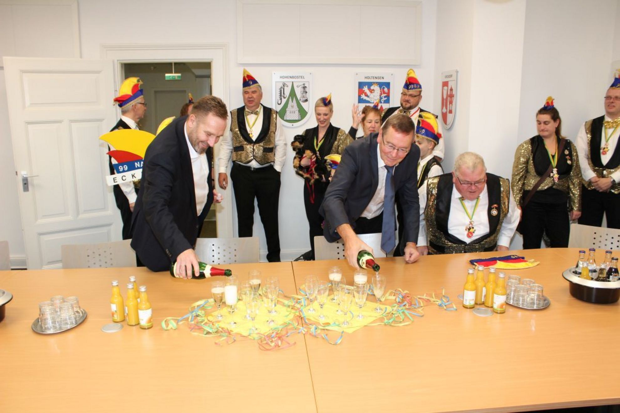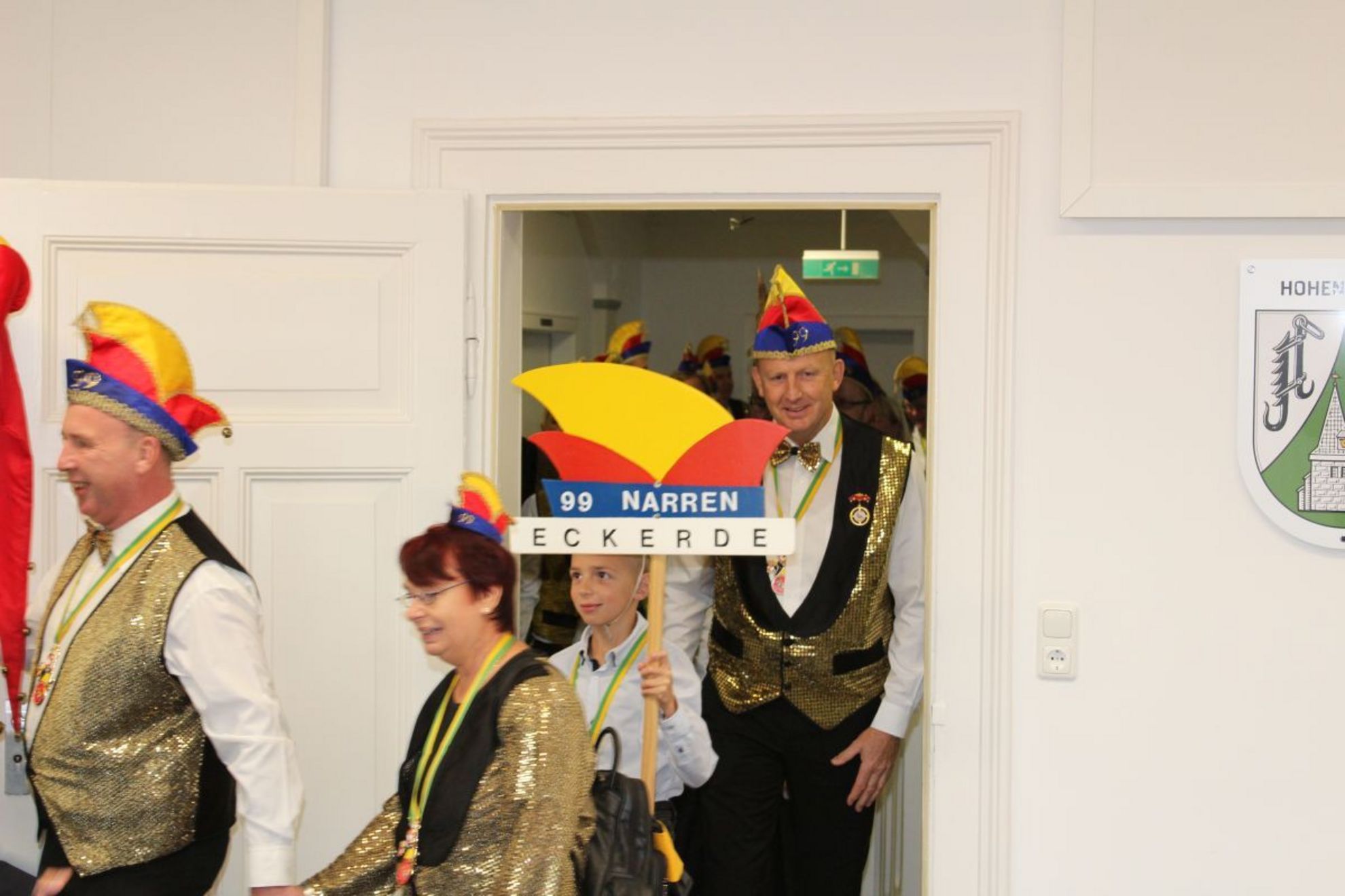 Die 99er Narren haben das Regiment übernommen: Um 11.11 Uhr haben die Eckerder Karnevalisten das Rathaus „gestürmt“ und von Bürgermeister Marc Lahmann den Rathausschlüssel übernommen. "Zum Glück bleibt der Schlüssel in Eckerde, da kann nichts schiefgehen", sagte Lahmann mit einem Augenzwickern. Präsident Wolfgang Pardey versprach: "Wir werden für ein bisschen mehr Abwechslung sorgen." Nach einem kräftigen "Helau" und einem kleinen Empfang verabschiedeten sich die Narren Richtung Eckerde. Mit einer internen Feier in der alten Schule in Eckerde starten die Eckerder Narren in ihre neue Session. Dabei bekommen auch die neu eingetretenen Mitglieder Sabine Effmert und Pia Koritke als äußeres Zeichen ihrer Mitgliedschaft bei den Narren vom Präsidenten Wolfgang Pardey ihre Narrenkappe überreicht. Diese Narrenkappen sind etwas ganz Besonderes, denn sie werden in Eigenarbeit von den „Närrinnen“ Margrit Bröder und Helga Weierhorst hergestellt. Inzwischen haben die 99er Narren 51 Mitglieder.