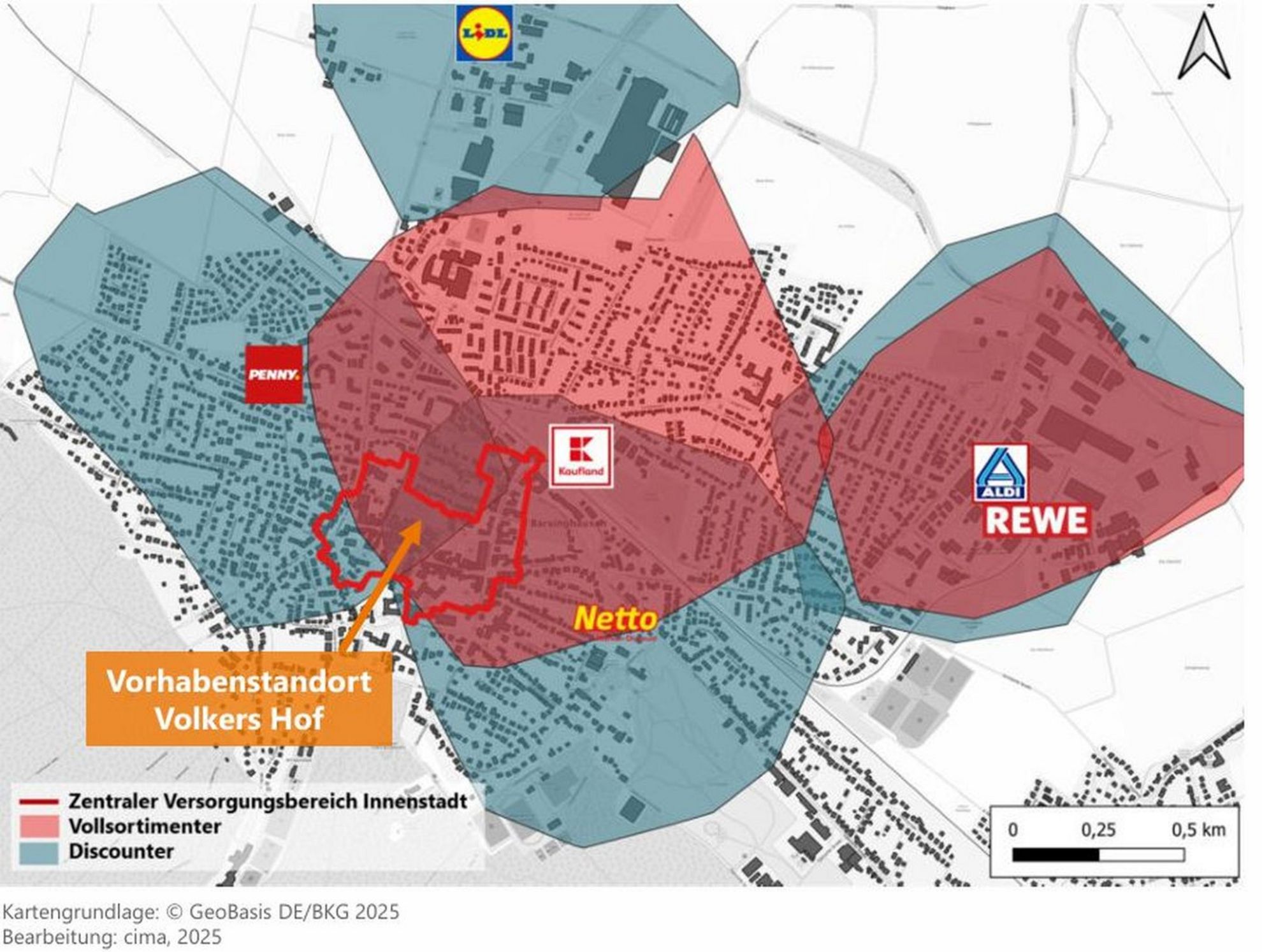 Das rund 7.500 Quadratmeter große Grundstück Volkers Hof liegt zentral im Stadtgebiet, größtenteils im Eigentum der Stadt Barsinghausen, aber auch in Privatbesitz. Aktuell wird es als Parkplatz und Veranstaltungsfläche genutzt. Eine Ansiedlung eines Lebensmittelmarktes wäre nach geltendem Bebauungsplan grundsätzlich möglich, so die Gutachter. CIMA betont jedoch: Das Vorhaben müsse „städtebaulich verträglich“ sein und dürfe keine negativen Auswirkungen auf andere Nahversorgungszentren haben.