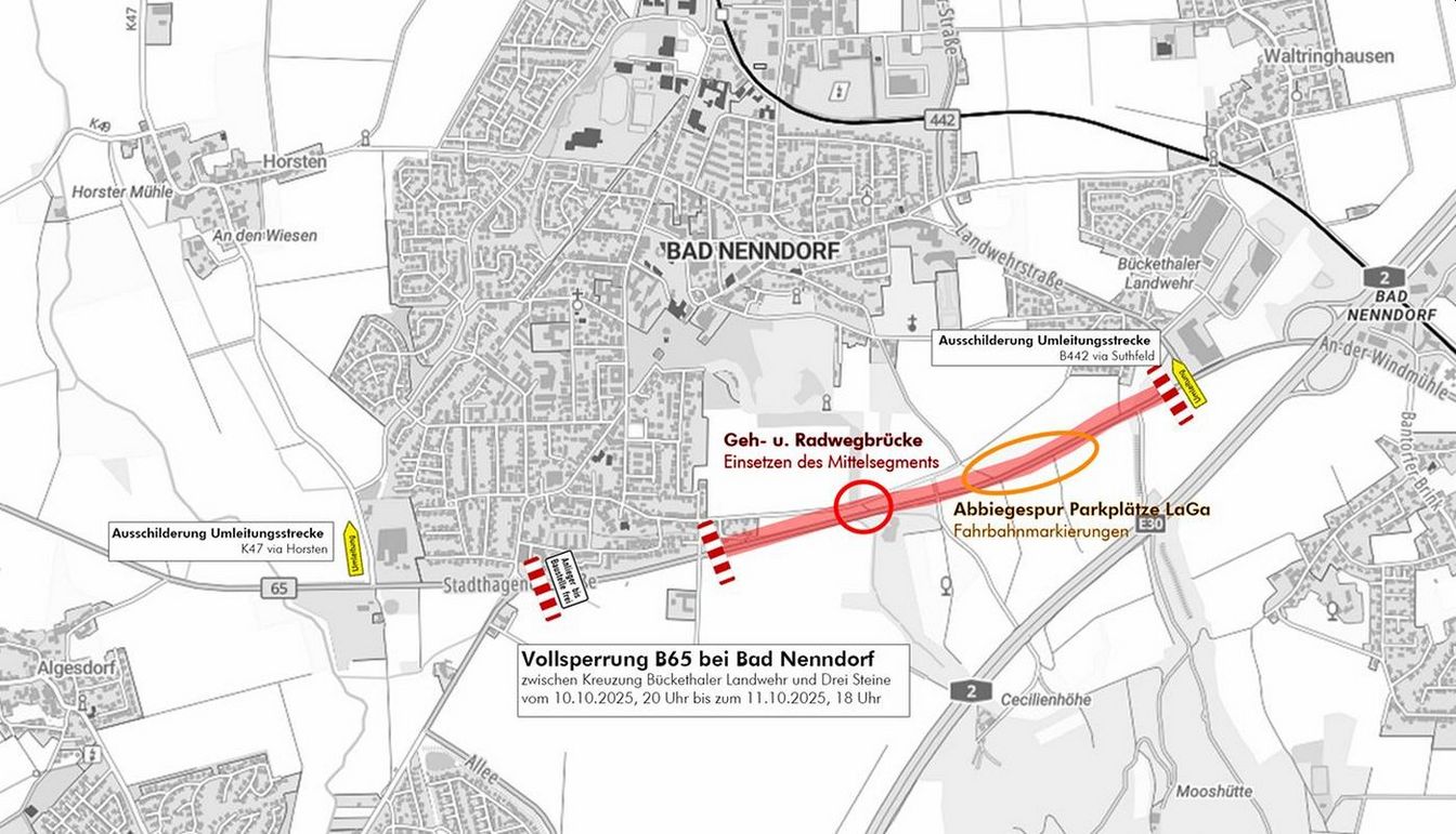 Hintergrund ist das Einheben des mittleren Brückenteils über die Fahrbahn. Dafür muss die B 65 im Abschnitt zwischen „Drei Steine“ und „Bückethaler Landwehr“ (Kreuzung bei Hellweg) voll gesperrt werden. Die Vollsperrung wird voraussichtlich am Freitag, 10. Oktober 2025, ab 20 Uhr eingerichtet und am Samstag, 11. Oktober 2025, spätestens um 18 Uhr wieder aufgehoben.