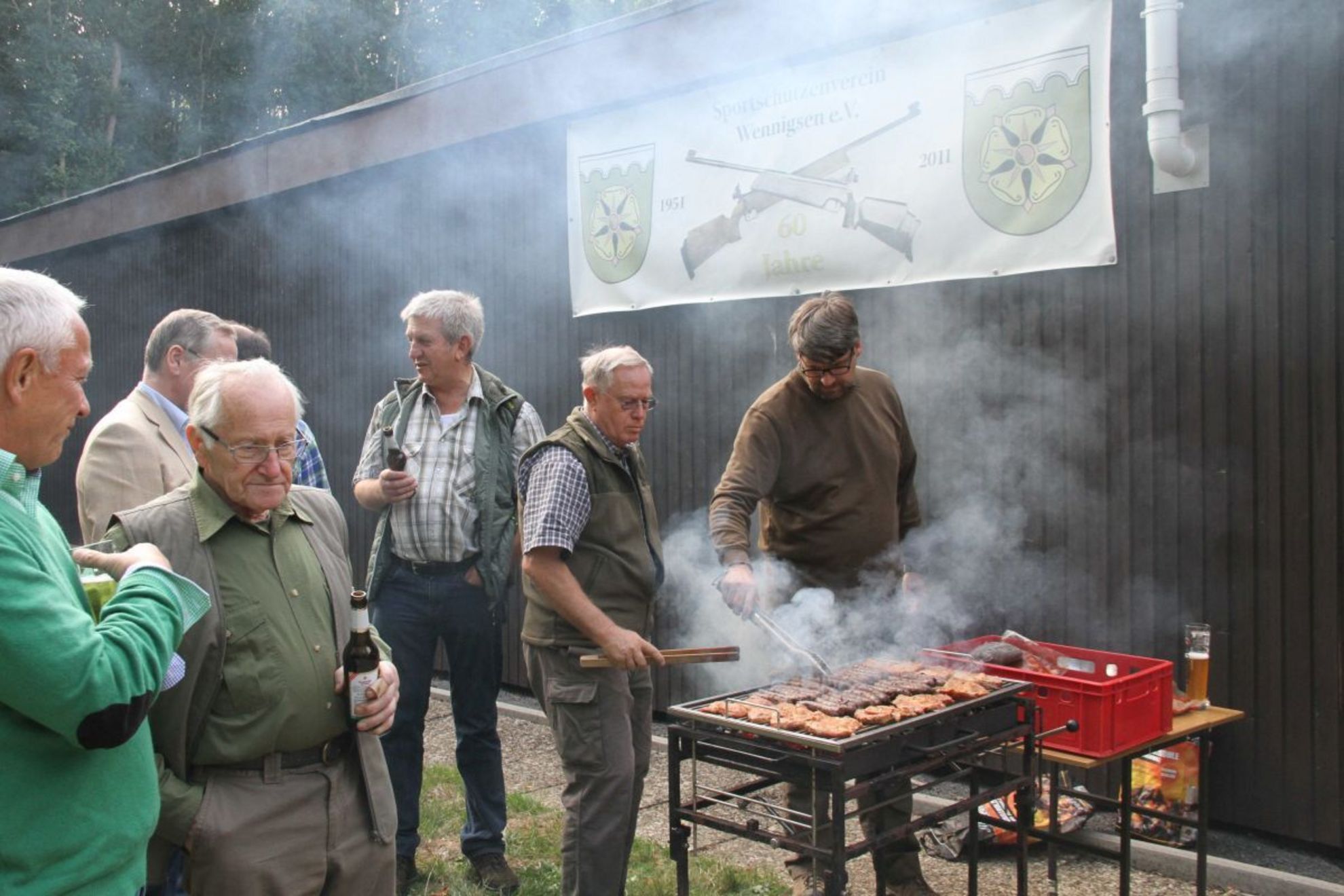 Als Wolfgang Schmidt seine Spende von 100 Wildbratwürstchen auf dem Gelände des Schützenvereins Wennigsen anlieferte, da warteten schon am angeheizten Grill Detlev Lehmann, Georg Wöltje und Horst Theobald. Nachdem Michael Breidenband und die Jagdhornbläser, unter ihnen auch der erste Vorsitzende der Jägerschaft Hannover-Land und sein Schatzmeister Christian Schaper das Hegeringgrillen eröffnet hatten, bedienten sich die Gäste mit leckeren Salaten und den Grillspezialitäten.