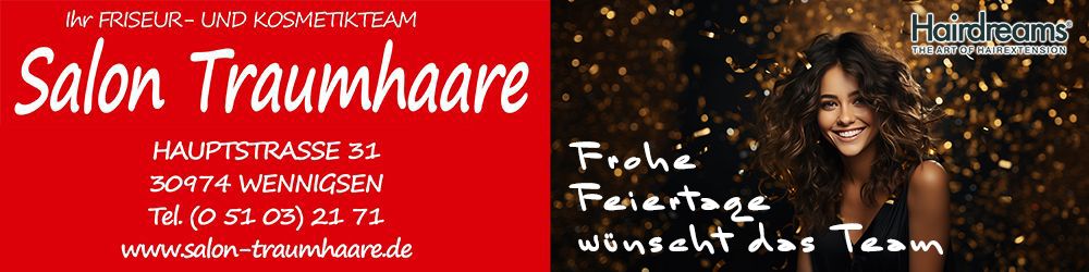 Wennigsen 01.12.2022 Kurznachrichten aus Wennigsen und den Ortsteilen [mehr] Anzeige 25.11.2025 Jusos Wennigsen und Barsinghausen starten Kleidersammelaktion für „Die!!! Weihnachtsfeier“ in Hannover Wennigsen/Barsinghausen. Die SPD-Jusos aus Wennigsen und Barsinghausen rufen auch in diesem Jahr zu ihrer mittlerweile… [mehr] Anzeige 25.11.2025 Bevölkerung: Region Hannover liegt weiter über 1,2 Millionen-Marke Region. Für 1.203.180 Menschen war die Region Hannover Ende September 2025 die erste Adresse. Die Bevölkerungszahl im… [mehr] 24.11.2025 Raumluft24 Klimatechnik – Im Herbst ist Wärme das neue Cool -Anzeige- Seit 1975 beschäftigt sich das Familienunternehmen Raumluft24 mit dem Thema Raumluft und hat sich seit fast… [mehr] Anzeige 24.11.2025 Sauber und Gepflegt durch jede Jahreszeit: Reinigungs-und Pflegeset zur BLACKWEEK geschenkt Anzeige. Haben Sie die letzten Herbsttage für eine Radtour genutzt? Dann ist ihr Rad vielleicht auf Grund der feuchten… [mehr] Anzeige 24.11.2025 Energetisch modernisieren: Gemeinde lädt wieder zum Energietreff ein Wennigsen. Das Beratungsformat Energietreff soll nun auch in anderen Ortsteilen angeboten werden. Dank der Unterstützung… [mehr] Anzeige 24.11.2025 „Orange Day 2025“: Gewalt gegen Frauen bleibt in Niedersachsen traurige Realität Hannover. Am Dienstag, 25. November, wird anlässlich des Internationalen Tages zur Beseitigung von Gewalt gegen Frauen… [mehr] 23.11.2025 Menschenrettung im Paritätischen Kinderzentrum - Zusammenspiel der vier Feuerwehren hervorragend Am Freitagmorgen 21. November, führten die Ortsfeuerwehren Holtensen, Bredenbeck, Evestorf und Wennigsen eine… [mehr] 21.11.2025 Black Friday - Tipps vom LKA für die Schnäppchenjagd Hannover. Am 28. November ist es wieder soweit. Diverse Onlinehändler nehmen auch dieses Jahr wieder am Black Friday… [mehr] 21.11.2025 Wechsel an der Spitze der Wennigser Feuerwehren: Mehrere Führungsämter neu besetzt Wennigsen. In der Gemeinde Wennigsen (Deister) ergeben sich zum Jahresende 2025 bedeutende Veränderungen in der… [mehr] 20.11.2025 Update: Pkw überschlägt sich auf der B217 – Zwei Personen mittelschwer verletzt Holtensen. Am Donnerstagnachmittag um 14.59 Uhr wurden die Feuerwehren Bredenbeck, Holtensen und Evestorf zu einem… [mehr] 20.11.2025 Bredenbeck: Arbeiten am Kanalanschluss führen zu Einschränkungen im Ortsverkehr Bredenbeck. Am Montag, 24. November, ab 7 Uhr bis voraussichtlich Freitag, 28. November, muss die Gemeinde Wennigsen in… [mehr] 19.11.2025 HSG Wennigsen/Gehrden: Starke Moral - knappe Niederlage in Bad Münder Wennigsen/Gehrden. Am späten Samstagnachmittag trat die HSG Wennigsen/Gehrden bei Deister Süntel II an und lieferte sich… [mehr] 18.11.2025 Wasserpark Wennigsen zieht positives Fazit trotz Wetterkapriolen Wennigsen. Die Badesaison 2025 im Wasserpark Wennigsen startete am 29. Mai und endete nach 116 Badetagen am 21.… [mehr] 18.11.2025 Mehr Sicherheit im Netz: Stadt und Region Hannover führen neue gov.de-Portale ein Hannover. Nachdem Hannover laut dem Verband Bitkom in diesem Jahr den Sprung unter die Top 10 der smartesten Großstädte… [mehr] 17.11.2025 Grüner Dialog in Wennigsen – Klimagerechtigkeit im Fokus Wennigsen. Am Freitag, 21. November, um 19.30 Uhr laden die Grünen Wennigsen zum nächsten „Grünen Dialog“ ein. Die… [mehr] 17.11.2025 Region unterstützt mit Babylotsinnen bei Krisen rund um die Geburt Region. Und plötzlich ist alles anders: Schwangerschaft und Geburt sind besonders, aber nicht immer eine unbeschwerte… [mehr] 16.11.2025 Polizeilicher Großeinsatz im Steintorviertel Hannover. Mit einer großangelegten Razzia in mehreren Etablissements im Steintorviertel hat die Polizeidirektion… [mehr] 14.11.2025 Calenberger Cantorei lädt zu einem besonderen Konzerterlebnis ein Sorsum. Gemeinsam mit dem Orchester accento aus Hannover lädt die Calenberger Cantorei zu einem besonderen… [mehr] 14.11.2025 Neue Regeln für Handys an Schulen – Hamburg und Niedersachsen setzen gemeinsam Maßstäbe Hannover. Smartphones, Smartwatches und digitale Geräte sind aus dem Alltag junger Menschen kaum wegzudenken – und… [mehr] 13.11.2025 Wennigsen blüht auf: Kunstspur & Gartenlust suchen noch Teilnehmer für 2026 Wennigsen. Am Wochenende des 30. und 31. Mai 2026 verwandelt sich Wennigsen erneut in ein lebendiges Zentrum für Kunst… [mehr] 13.11.2025 Niedersachsen wirbt für eine aktive Väterrolle - „Das Bild von Familie ist bunter geworden und wandelt sich weiter“ Hannover. Das Niedersächsische Sozialministerium hat eine Postkartenaktion ins Leben gerufen, um verstärkt für eine… [mehr] 12.11.2025 Farben, Fantasie und famoser Unsinn – Clowns im Theater am Spalterhals Barsinghausen. Am 22. November 2025 lädt Calenberger Cultour & Co e.V. zu einem ganz besonderen Highlight ins Theater am… [mehr] 12.11.2025 Wasserpark Wennigsen soll ganzjährig nutzbar werden - interkommunale Zusammenarbeit geplant Wennigsen/Region. Der Wasserpark Wennigsen gehört seit Jahrzehnten zu den beliebtesten Treffpunkten in Wennigsen und der… [mehr] 12.11.2025 Landesbehörde gut für den winterlichen Streu- und Räumdienst aufgestellt Hannover. Die Vorbereitungen für den Winterdienst auf den Bundes- und Landesstraßen sowie vielen Kreisstraßen in… [mehr]