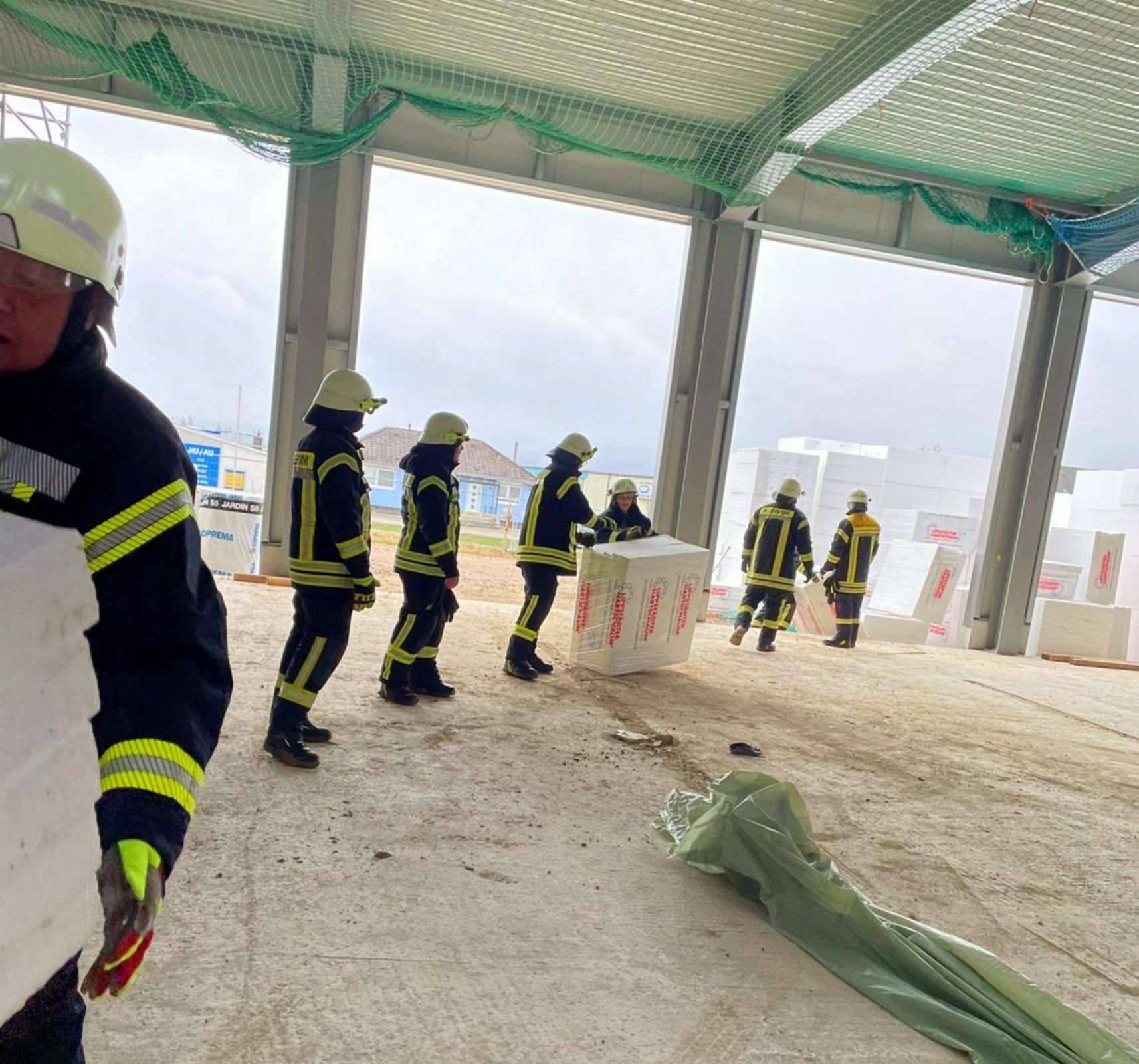 Am Neubau des Feuerwehrhauses an der Danquardstraße hatte der Sturm Dämmmaterial von der Baustelle erfasst und über angrenzende Straßen sowie Grundstücke verteilt. Die alarmierten Kameraden sammelten das umhergewehte Material ein und brachten es im Inneren des Neubaus in Sicherheit.
