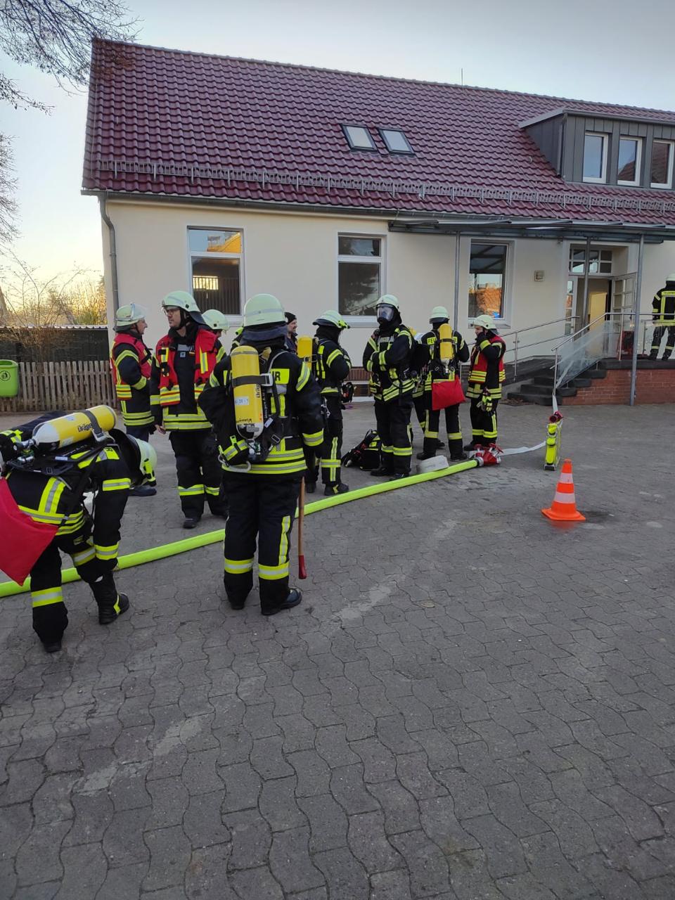 Beim Eintreffen der ersten Einsatzkräfte war das Gebäude bereits verraucht. Hierfür wurde eine Nebelmaschine eingesetzt. Die drei vermissten Übungspuppen mussten unter realistischen Bedingungen aufgesucht und gerettet werden.