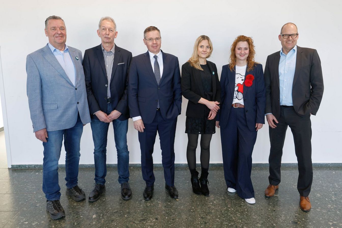 v.l.: Christian Bickel, Betriebsratsvorsitzender der ÜSTRA, Rainer Weber, stellvertretender Aufsichtsratsvorsitzender der regiobus Olof Seidel, Vorstand für Finanzen und Recht der ÜSTRA, Elke van Zadel, Vorstandsvorsitzende der ÜSTRA, Denise Hain, Vorständin Betrieb und Personal sowie Arbeitsdirektorin der ÜSTRA Ulf-Birger Franz, Aufsichtsratsvorsitzender der ÜSTRA und Verkehrsdezernent der Region Hannover. Foto: ÜSTRA / Arp.